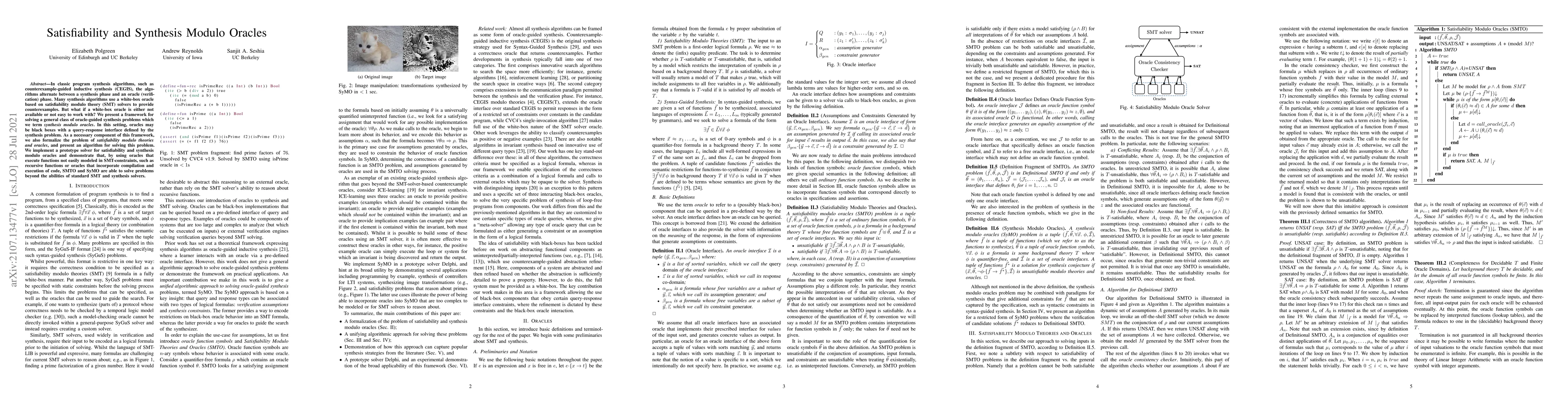 This paper proposes a framework for synthesis modulo oracles (SMTO), enabling program synthesis when white-box oracles are unavailable or impractical. It introduces an algorithm for solving satisfiability modulo theories and oracles, demonstrating the ability to handle complex problems beyond standard SMT solvers.
