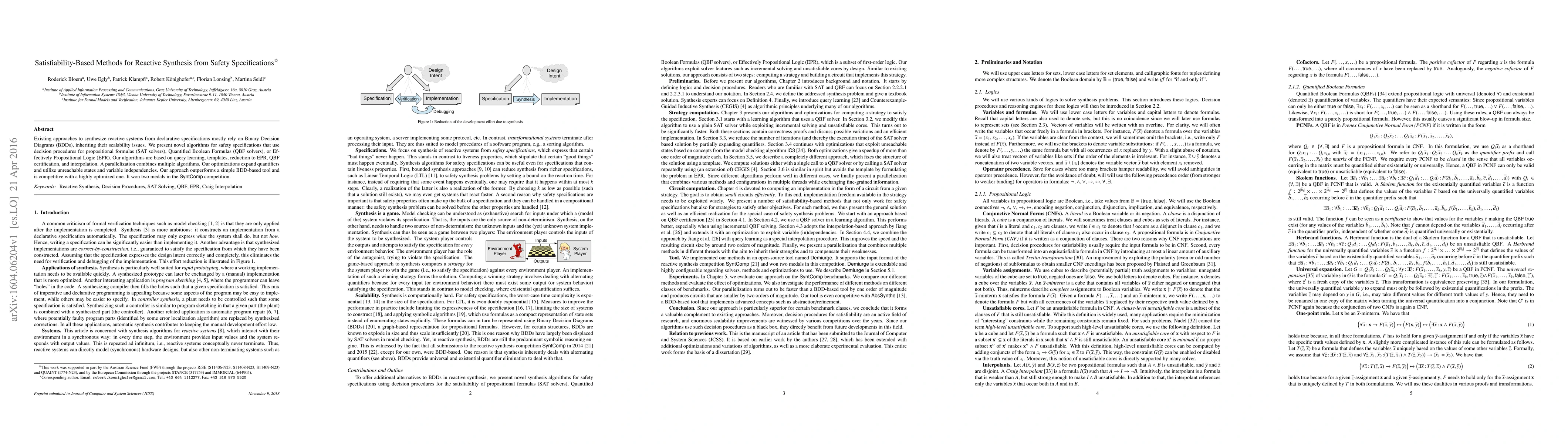 This paper introduces novel algorithms for synthesizing reactive systems from safety specifications, leveraging SAT solvers, QBF solvers, and EPR techniques, which outperform traditional BDD-based methods. The proposed approach uses query learning, templates, and parallelization to optimize scalability and efficiency.