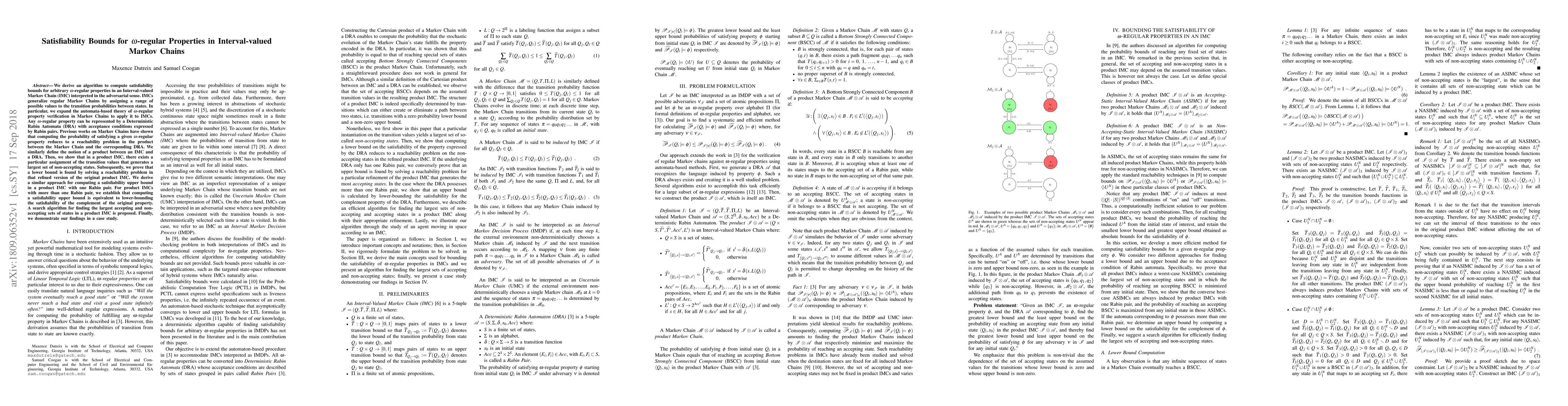 We derive an algorithm to compute satisfiability bounds for arbitrary {\omega}-regular properties in an Interval-valued Markov Chain (IMC) interpreted in the adversarial sense. IMCs generalize regular Markov Chains by assigning a range of possible values to the transition probabilities between states. In particular, we expand the automata-based theory of {\omega}-regular property verification in Markov Chains to apply it to IMCs. Any {\omega}-regular property can be represented by a Deterministic Rabin Automata (DRA) with acceptance conditions expressed by Rabin pairs. Previous works on Markov Chains have shown that computing the probability of satisfying a given {\omega}-regular property reduces to a reachability problem in the product between the Markov Chain and the corresponding DRA. We similarly define the notion of a product between an IMC and a DRA. Then, we show that in a product IMC, there exists a particular assignment of the transition values that generates a largest set of non-accepting states. Subsequently, we prove that a lower bound is found by solving a reachability problem in that refined version of the original product IMC. We derive a similar approach for computing a satisfiability upper bound in a product IMC with one Rabin pair. For product IMCs with more than one Rabin pair, we establish that computing a satisfiability upper bound is equivalent to lower-bounding the satisfiability of the complement of the original property. A search algorithm for finding the largest accepting and non-accepting sets of states in a product IMC is proposed. Finally, we demonstrate our findings in a case study.