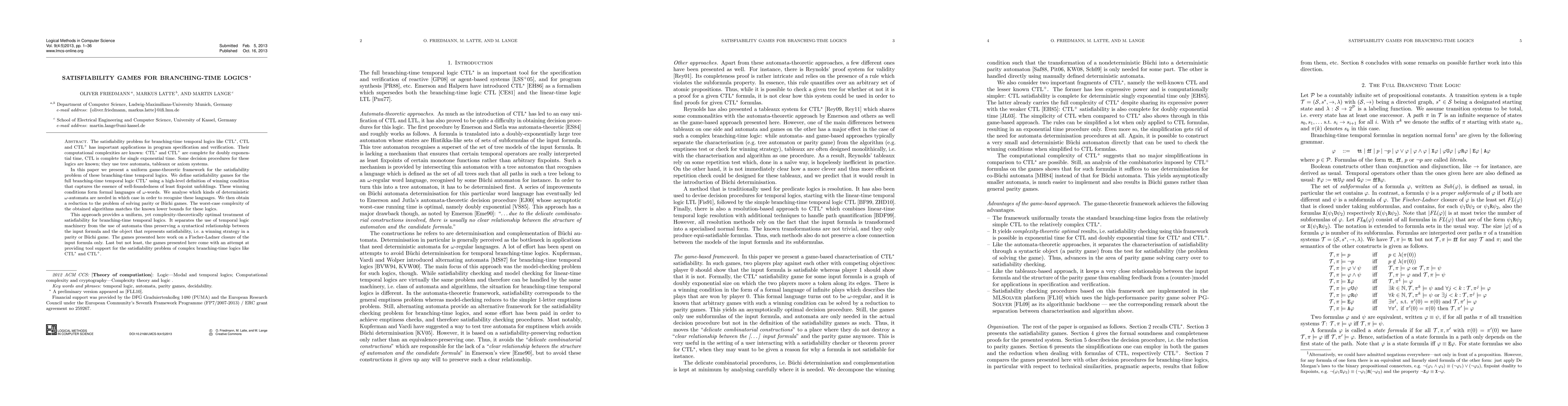 The satisfiability problem for branching-time temporal logics like CTL*, CTL and CTL+ has important applications in program specification and verification. Their computational complexities are known: CTL* and CTL+ are complete for doubly exponential time, CTL is complete for single exponential time. Some decision procedures for these logics are known; they use tree automata, tableaux or axiom systems. In this paper we present a uniform game-theoretic framework for the satisfiability problem of these branching-time temporal logics. We define satisfiability games for the full branching-time temporal logic CTL* using a high-level definition of winning condition that captures the essence of well-foundedness of least fixpoint unfoldings. These winning conditions form formal languages of \omega-words. We analyse which kinds of deterministic {\omega}-automata are needed in which case in order to recognise these languages. We then obtain a reduction to the problem of solving parity or B\"uchi games. The worst-case complexity of the obtained algorithms matches the known lower bounds for these logics. This approach provides a uniform, yet complexity-theoretically optimal treatment of satisfiability for branching-time temporal logics. It separates the use of temporal logic machinery from the use of automata thus preserving a syntactical relationship between the input formula and the object that represents satisfiability, i.e. a winning strategy in a parity or B\"uchi game. The games presented here work on a Fischer-Ladner closure of the input formula only. Last but not least, the games presented here come with an attempt at providing tool support for the satisfiability problem of complex branching-time logics like CTL* and CTL+.