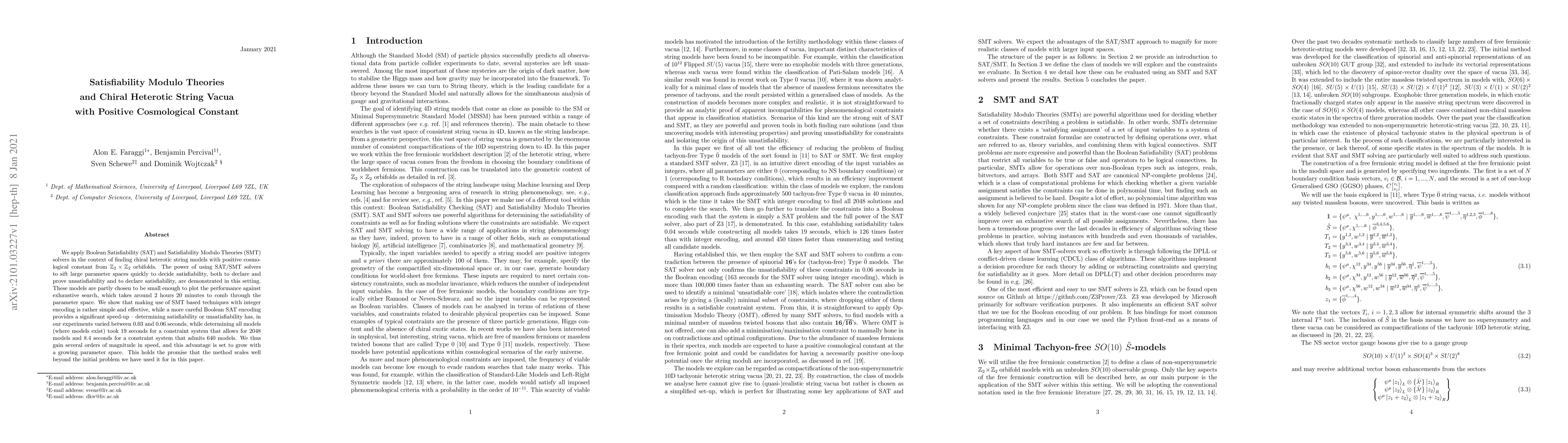 We apply Boolean Satisfiability (SAT) and Satisfiability Modulo Theories (SMT) solvers in the context of finding chiral heterotic string models with positive cosmological constant from $\mathbb{Z}_2\times \mathbb{Z}_2$ orbifolds. The power of using SAT/SMT solvers to sift large parameter spaces quickly to decide satisfiability, both to declare and prove unsatisfiability and to declare satisfiability, are demonstrated in this setting. These models are partly chosen to be small enough to plot the performance against exhaustive search, which takes around 2 hours 20 minutes to comb through the parameter space. We show that making use of SMT based techniques with integer encoding is rather simple and effective, while a more careful Boolean SAT encoding provides a significant speed-up -- determining satisfiability or unsatisfiability has, in our experiments varied between 0.03 and 0.06 seconds, while determining all models (where models exist) took 19 seconds for a constraint system that allows for 2048 models and 8.4 seconds for a constraint system that admits 640 models. We thus gain several orders of magnitude in speed, and this advantage is set to grow with a growing parameter space. This holds the promise that the method scales well beyond the initial problem we have used it for in this paper.