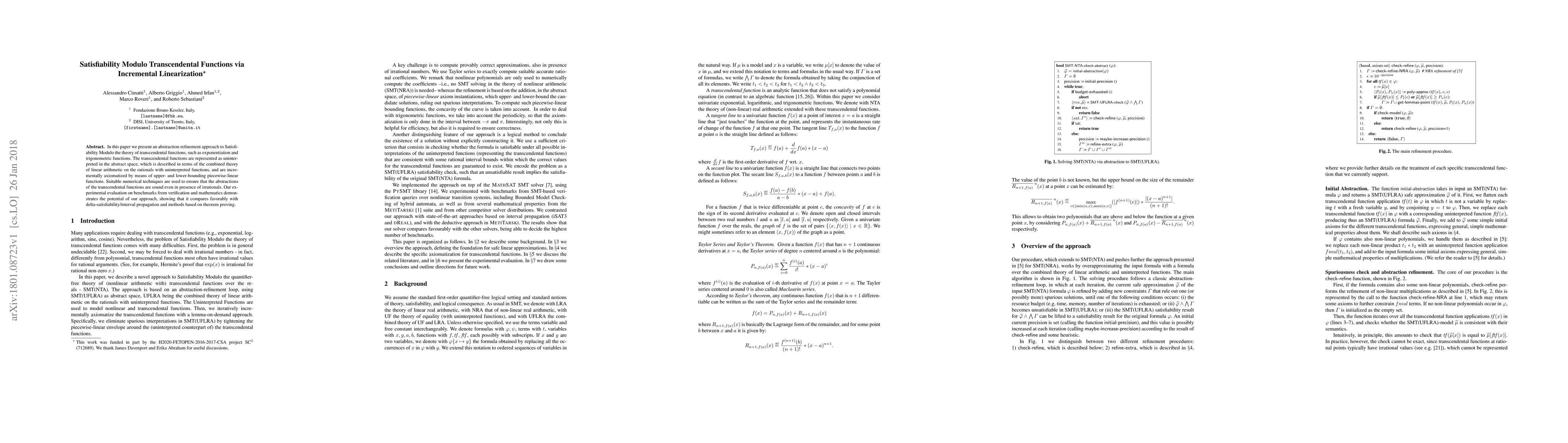 This paper proposes an abstraction-refinement method for solving Satisfiability Modulo Transcendental Functions by incrementally linearizing these functions using upper- and lower-bounding piecewise-linear approximations, demonstrating competitive performance against existing verification methods.