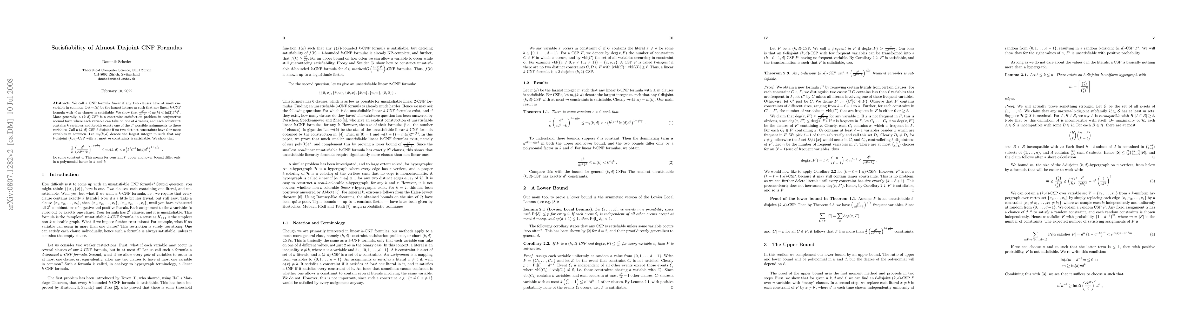 This paper investigates the satisfiability of linear k-CNF formulas and l-disjoint (k,d)-CSPs, establishing bounds on the maximum number of clauses for which these formulas remain satisfiable. It provides tight bounds on m(k) and m_l(k,d) showing that for constant l, the upper and lower bounds differ only by a polynomial factor in d and k.