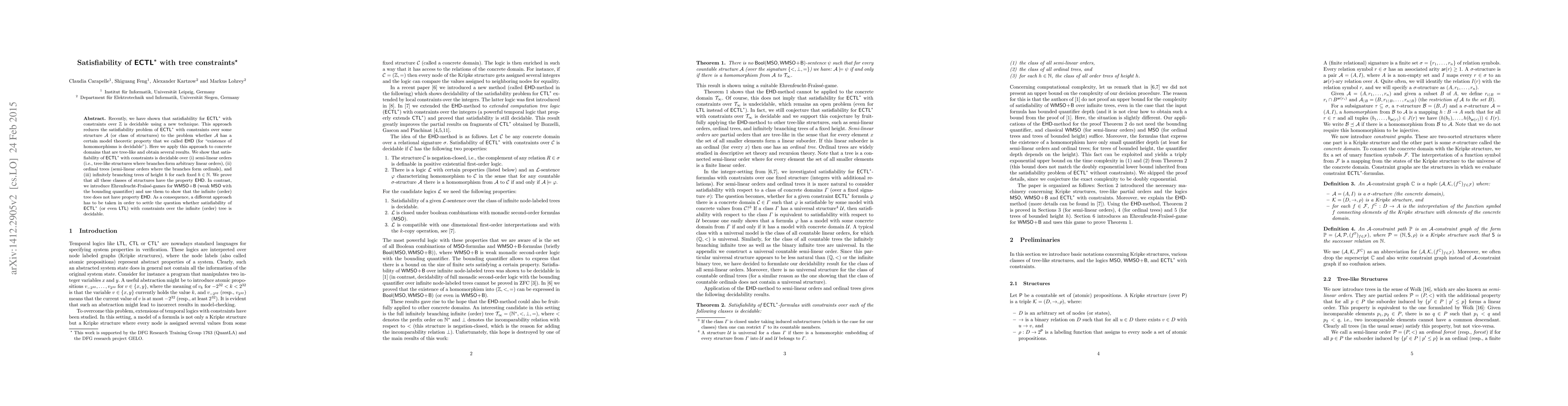 Recently, we have shown that satisfiability for $\mathsf{ECTL}^*$ with constraints over $\mathbb{Z}$ is decidable using a new technique. This approach reduces the satisfiability problem of $\mathsf{ECTL}^*$ with constraints over some structure A (or class of structures) to the problem whether A has a certain model theoretic property that we called EHD (for "existence of homomorphisms is decidable"). Here we apply this approach to concrete domains that are tree-like and obtain several results. We show that satisfiability of $\mathsf{ECTL}^*$ with constraints is decidable over (i) semi-linear orders (i.e., tree-like structures where branches form arbitrary linear orders), (ii) ordinal trees (semi-linear orders where the branches form ordinals), and (iii) infinitely branching trees of height h for each fixed $h\in \mathbb{N}$. We prove that all these classes of structures have the property EHD. In contrast, we introduce Ehrenfeucht-Fraisse-games for $\mathsf{WMSO}+\mathsf{B}$ (weak $\mathsf{MSO}$ with the bounding quantifier) and use them to show that the infinite (order) tree does not have property EHD. As a consequence, a different approach has to be taken in order to settle the question whether satisfiability of $\mathsf{ECTL}^*$ (or even $\mathsf{LTL}$) with constraints over the infinite (order) tree is decidable.