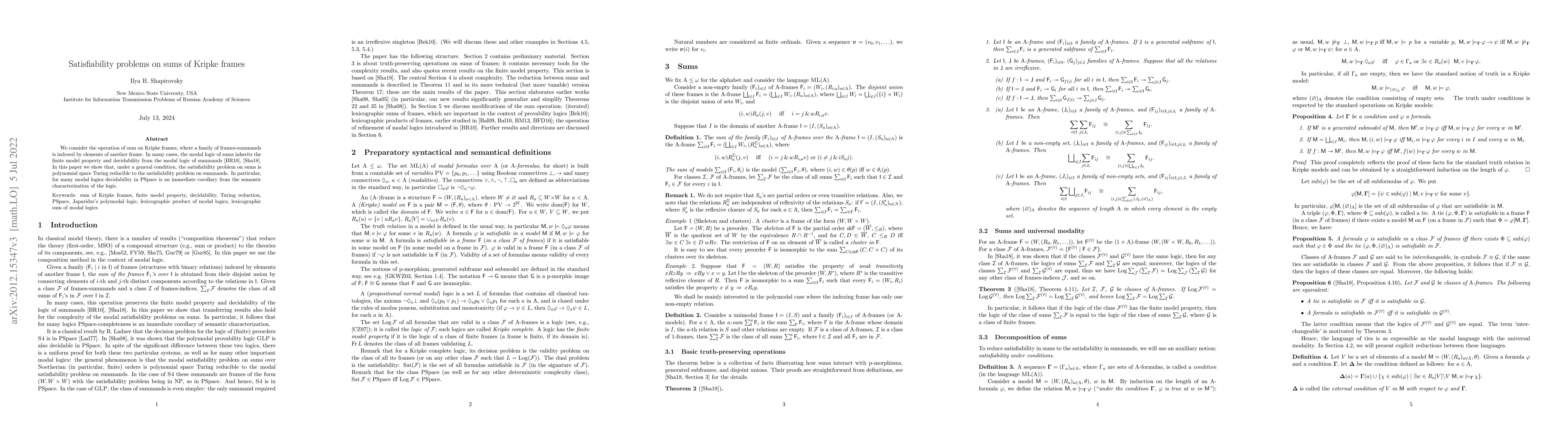This paper investigates the satisfiability problem for modal logics on sums of Kripke frames, demonstrating that under certain conditions, it is polynomially reducible to the satisfiability problem on the summands, leading to decidability in PSPACE.
