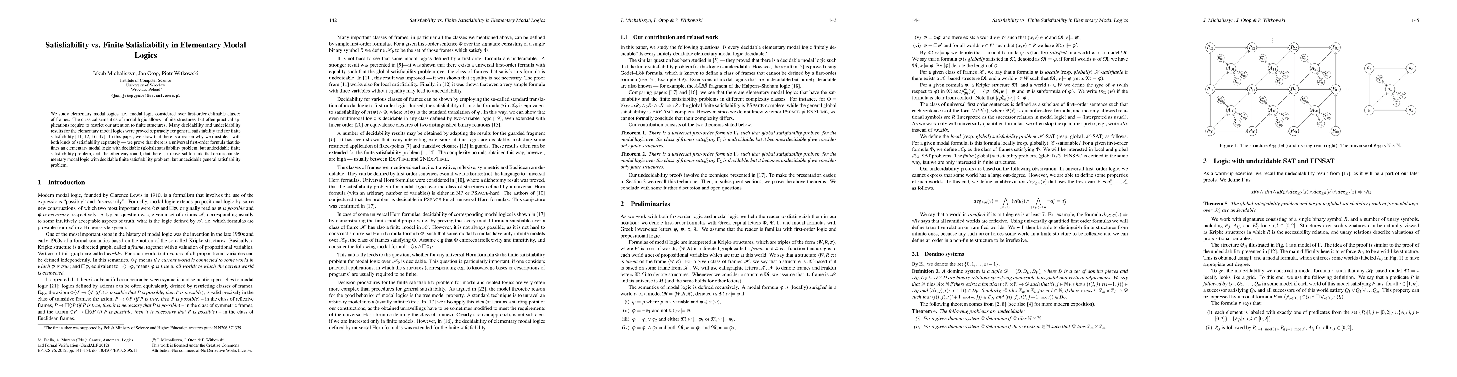 We study elementary modal logics, i.e. modal logic considered over first-order definable classes of frames. The classical semantics of modal logic allows infinite structures, but often practical applications require to restrict our attention to finite structures. Many decidability and undecidability results for the elementary modal logics were proved separately for general satisfiability and for finite satisfiability [11, 12, 16, 17]. In this paper, we show that there is a reason why we must deal with both kinds of satisfiability separately -- we prove that there is a universal first-order formula that defines an elementary modal logic with decidable (global) satisfiability problem, but undecidable finite satisfiability problem, and, the other way round, that there is a universal formula that defines an elementary modal logic with decidable finite satisfiability problem, but undecidable general satisfiability problem.