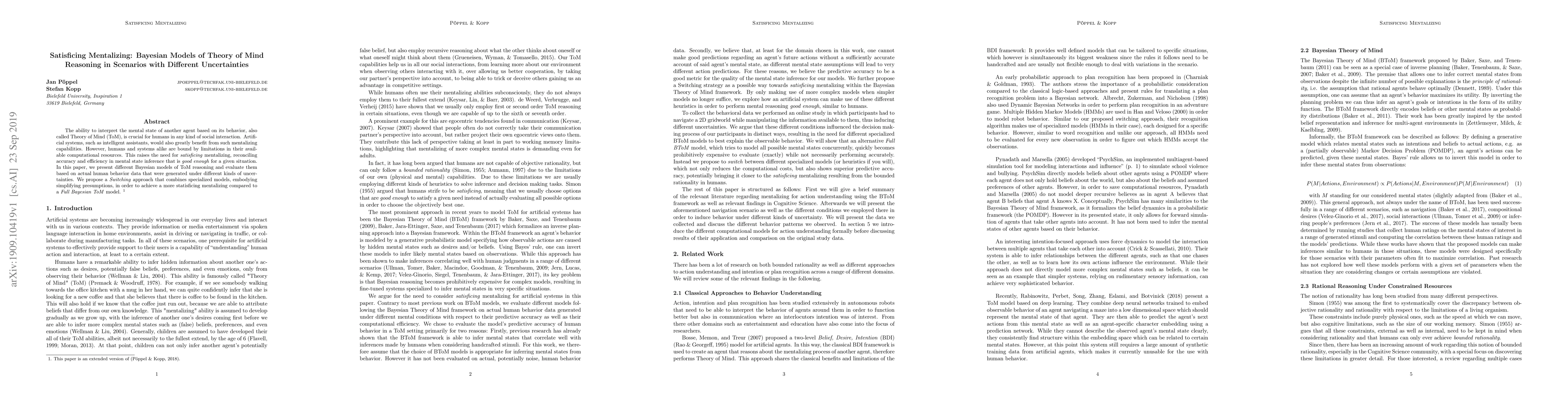 The ability to interpret the mental state of another agent based on its behavior, also called Theory of Mind (ToM), is crucial for humans in any kind of social interaction. Artificial systems, such as intelligent assistants, would also greatly benefit from such mentalizing capabilities. However, humans and systems alike are bound by limitations in their available computational resources. This raises the need for satisficing mentalizing, reconciling accuracy and efficiency in mental state inference that is good enough for a given situation. In this paper, we present different Bayesian models of ToM reasoning and evaluate them based on actual human behavior data that were generated under different kinds of uncertainties. We propose a Switching approach that combines specialized models, embodying simplifying presumptions, in order to achieve a more statisficing mentalizing compared to a Full Bayesian ToM model.