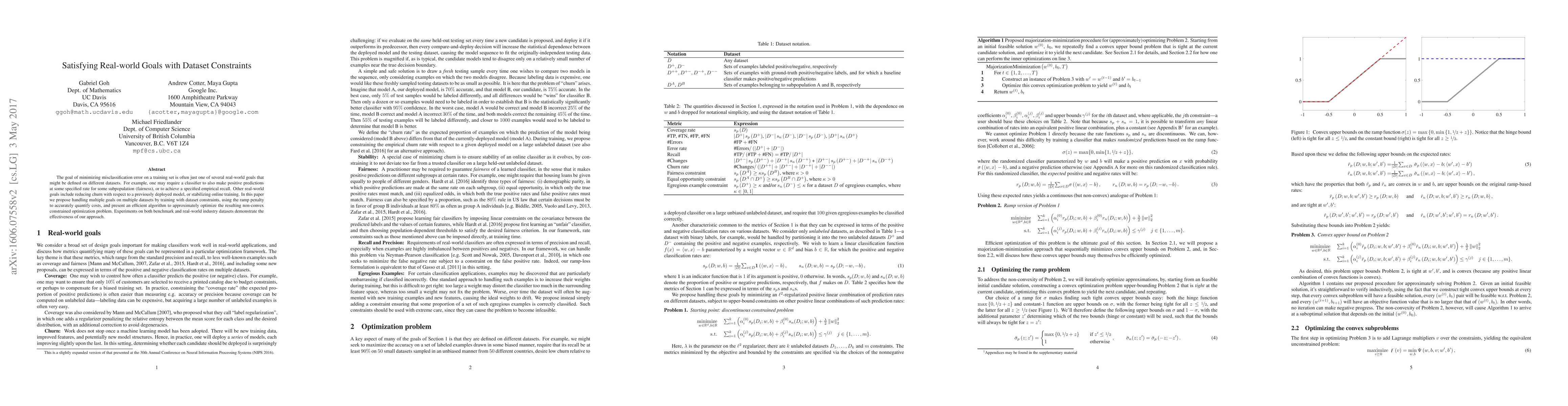 This paper proposes a method to minimize misclassification error while satisfying multiple real-world goals, such as fairness and churn reduction, by training with dataset constraints and employing the ramp penalty. An efficient algorithm is presented to optimize the non-convex constrained optimization problem, validated through experiments on both benchmark and industry datasets.
