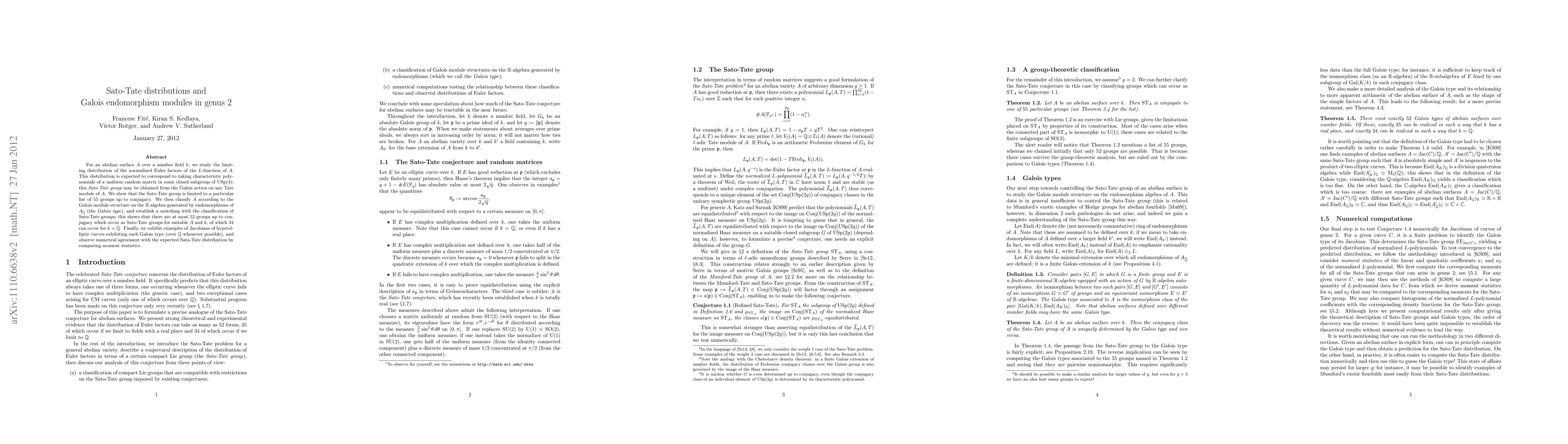 For an abelian surface A over a number field k, we study the limiting distribution of the normalized Euler factors of the L-function of A. This distribution is expected to correspond to taking characteristic polynomials of a uniform random matrix in some closed subgroup of USp(4); this Sato-Tate group may be obtained from the Galois action on any Tate module of A. We show that the Sato-Tate group is limited to a particular list of 55 groups up to conjugacy. We then classify A according to the Galois module structure on the R-algebra generated by endomorphisms of A_Qbar (the Galois type), and establish a matching with the classification of Sato-Tate groups; this shows that there are at most 52 groups up to conjugacy which occur as Sato-Tate groups for suitable A and k, of which 34 can occur for k = Q. Finally, we exhibit examples of Jacobians of hyperelliptic curves exhibiting each Galois type (over Q whenever possible), and observe numerical agreement with the expected Sato-Tate distribution by comparing moment statistics.