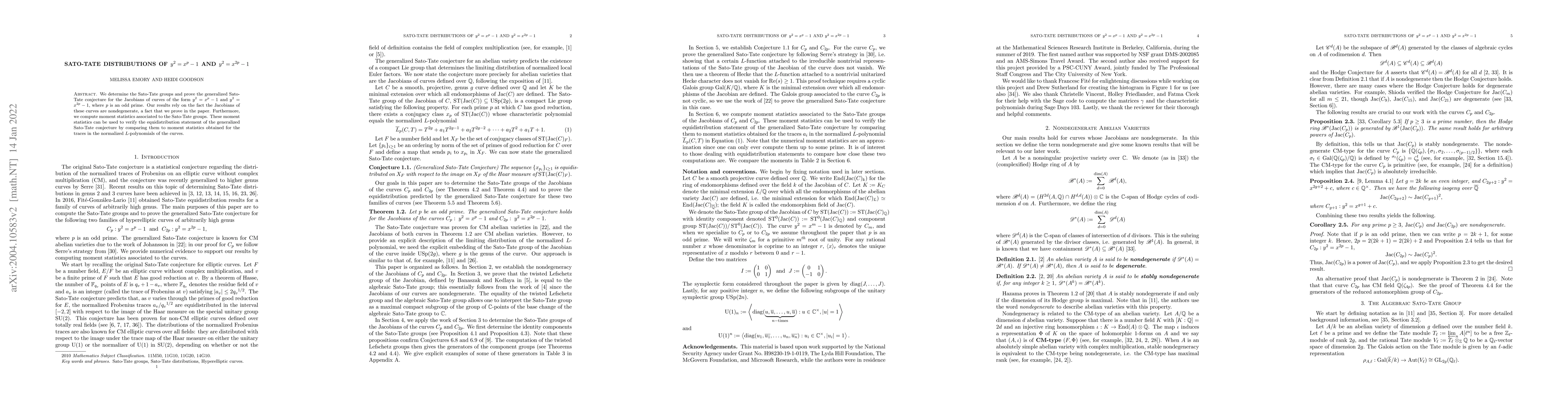 This paper determines the Sato-Tate groups and verifies the generalized Sato-Tate conjecture for Jacobians of curves defined by $y^2=x^p-1$ and $y^2=x^{2p}-1$ for odd prime $p$, proving their nondegeneracy. It also computes moment statistics that support the conjecture's equidistribution statement.