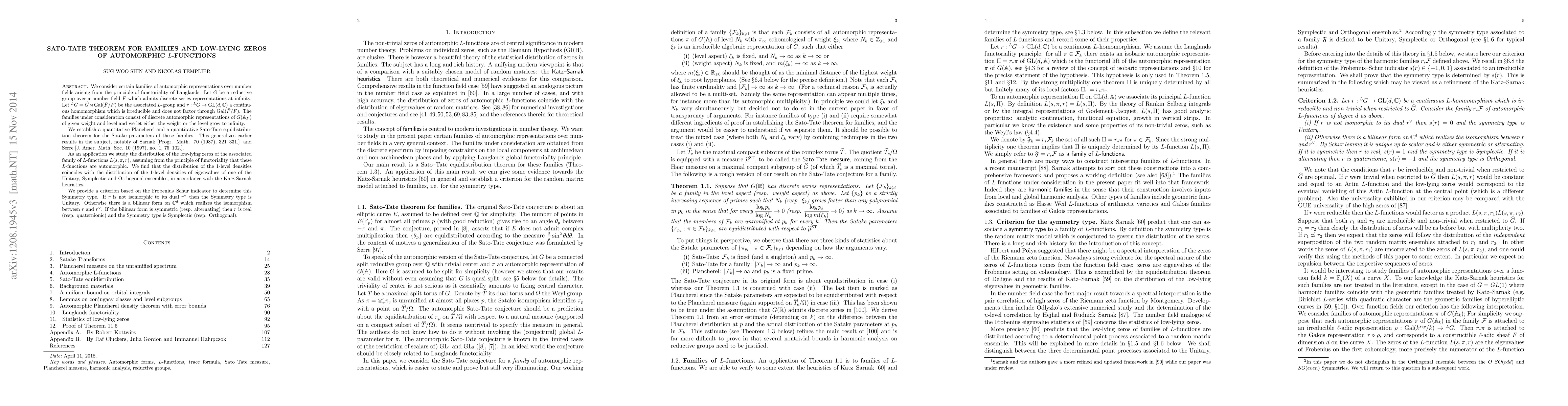 The paper employs techniques from harmonic analysis and the theory of automorphic representations, specifically focusing on the Sato-Tate theorem for families of automorphic representations and the distribution of low-lying zeros of associated L-functions.