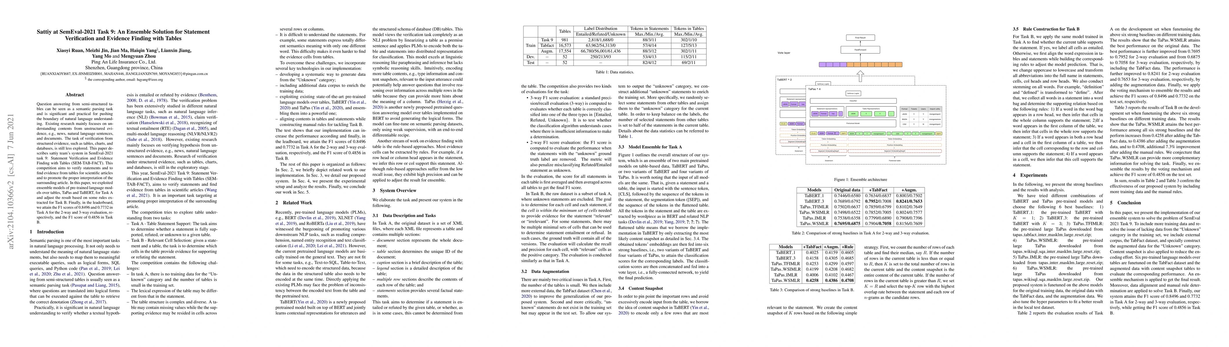 Question answering from semi-structured tables can be seen as a semantic parsing task and is significant and practical for pushing the boundary of natural language understanding. Existing research mainly focuses on understanding contents from unstructured evidence, e.g., news, natural language sentences, and documents. The task of verification from structured evidence, such as tables, charts, and databases, is still less explored. This paper describes sattiy team's system in SemEval-2021 task 9: Statement Verification and Evidence Finding with Tables (SEM-TAB-FACT). This competition aims to verify statements and to find evidence from tables for scientific articles and to promote the proper interpretation of the surrounding article. In this paper, we exploited ensemble models of pre-trained language models over tables, TaPas and TaBERT, for Task A and adjust the result based on some rules extracted for Task B. Finally, in the leaderboard, we attain the F1 scores of 0.8496 and 0.7732 in Task A for the 2-way and 3-way evaluation, respectively, and the F1 score of 0.4856 in Task B.