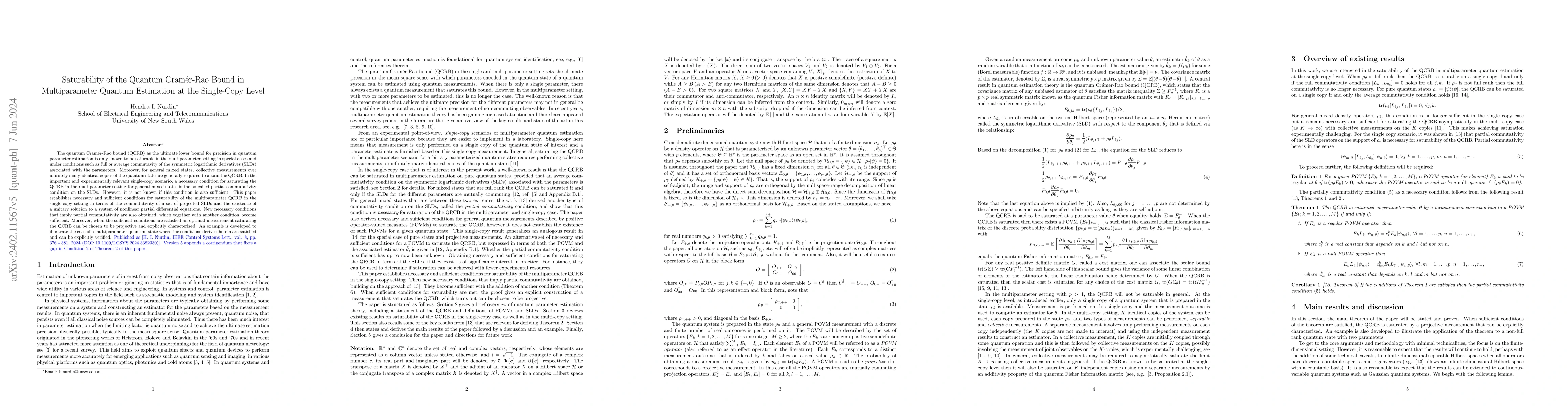 This paper investigates the conditions under which the quantum Cramér-Rao bound (QCRB) can be saturated in multiparameter quantum estimation with a single quantum copy. It establishes necessary and sufficient conditions for saturability in terms of the commutativity of projected symmetric logarithmic derivatives and the existence of a unitary solution to a system of nonlinear partial differential equations, providing a projective and explicit optimal measurement when conditions are met.
