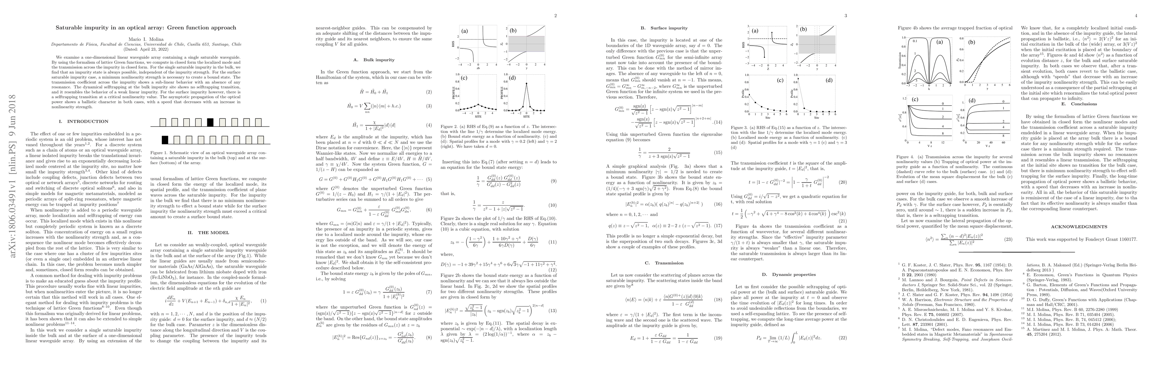 We examine a one-dimensional linear waveguide array containing a single saturable waveguide. By using the formalism of lattice Green functions, we compute in closed form the localized mode and the transmission across the impurity in closed form. For the single saturable impurity in the bulk, we find that an impurity state is always possible, independent of the impurity strength. For the surface saturable impurity case, a minimum nonlinearity strength is necessary to create a bound state. The transmission coefficient across the impurity shows a sub-linear behavior with an absence of any resonance. The dynamical selftrapping at the bulk impurity site shows no selftrapping transition, and it resembles the behavior of a weak linear impurity. For the surface impurity however, there is a selftrapping transition at a critical nonlinearity value. The asymptotic propagation of the optical power shows a ballistic character in both cases, with a speed that decreases with an increase in nonlinearity strength.