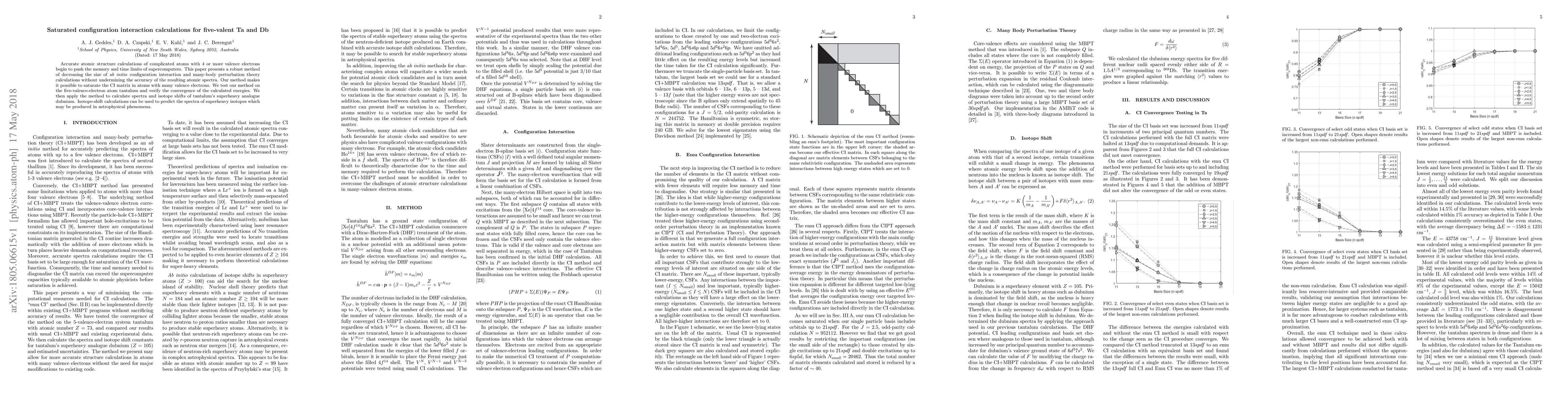 Accurate atomic structure calculations of complicated atoms with 4 or more valence electrons begin to push the memory and time limits of supercomputers. This paper presents a robust method of decreasing the size of \textit{ab initio} configuration interaction and many-body perturbation theory calculations without undermining the accuracy of the resulting atomic spectra. Our method makes it possible to saturate the CI matrix in atoms with many valence electrons. We test our method on the five-valence-electron atom tantalum and verify the convergence of the calculated energies. We then apply the method to calculate spectra and isotope shifts of tantalum's superheavy analogue dubnium. Isotope-shift calculations can be used to predict the spectra of superheavy isotopes which may be produced in astrophysical phenomena.