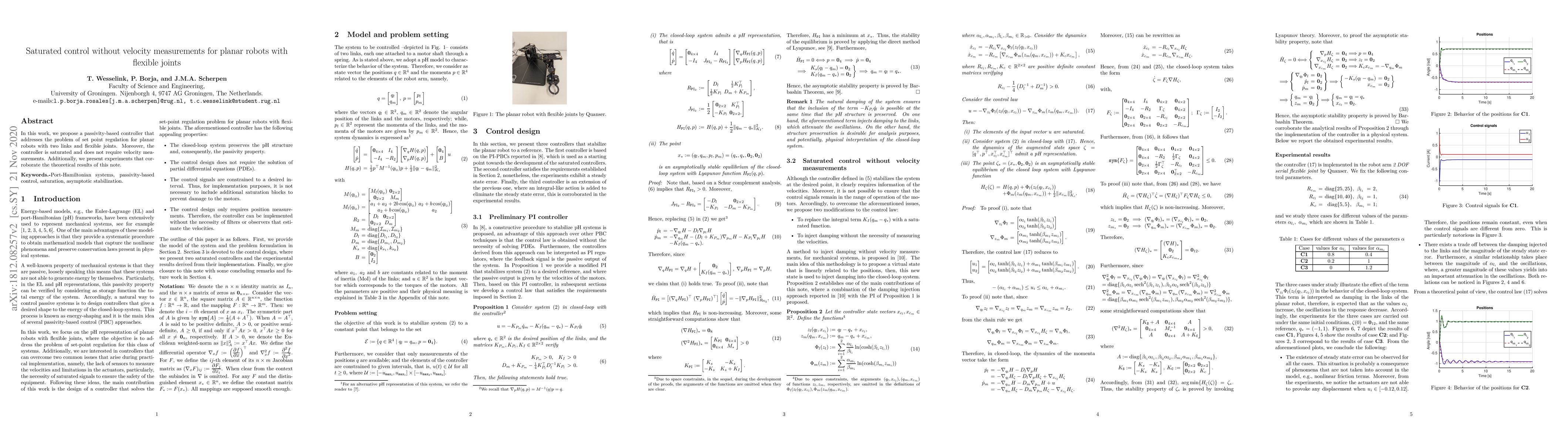This paper proposes a passivity-based saturated controller for planar robots with flexible joints, enabling set point regulation without velocity measurements. Experimental results validate the theoretical findings.