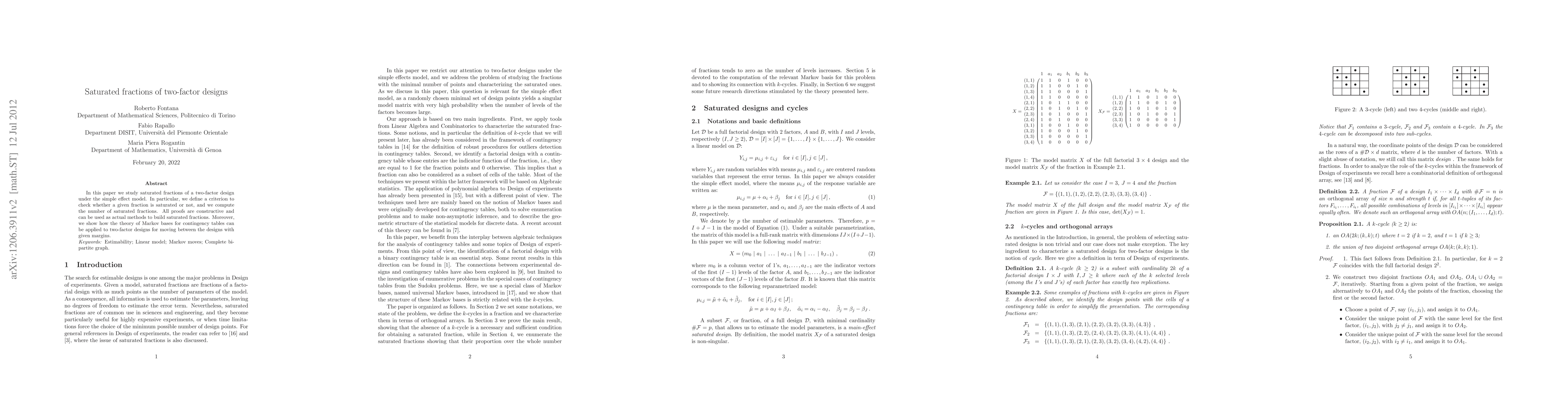 In this paper we study saturated fractions of a two-factor design under the simple effect model. In particular, we define a criterion to check whether a given fraction is saturated or not, and we compute the number of saturated fractions. All proofs are constructive and can be used as actual methods to build saturated fractions. Moreover, we show how the theory of Markov bases for contingency tables can be applied to two-factor designs for moving between the designs with given margins.
