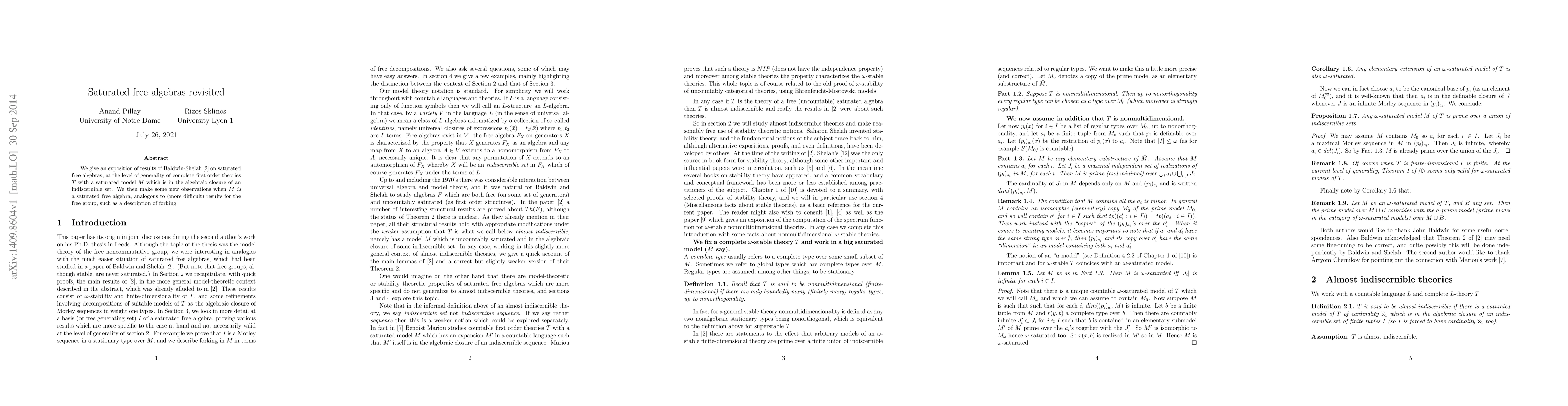 This paper revisits Baldwin-Shelah's results on saturated free algebras within the context of complete first-order theories, focusing on models in the algebraic closure of indiscernible sets. It introduces new insights regarding forking when the model is a saturated free algebra, paralleling complex results for the free group.
