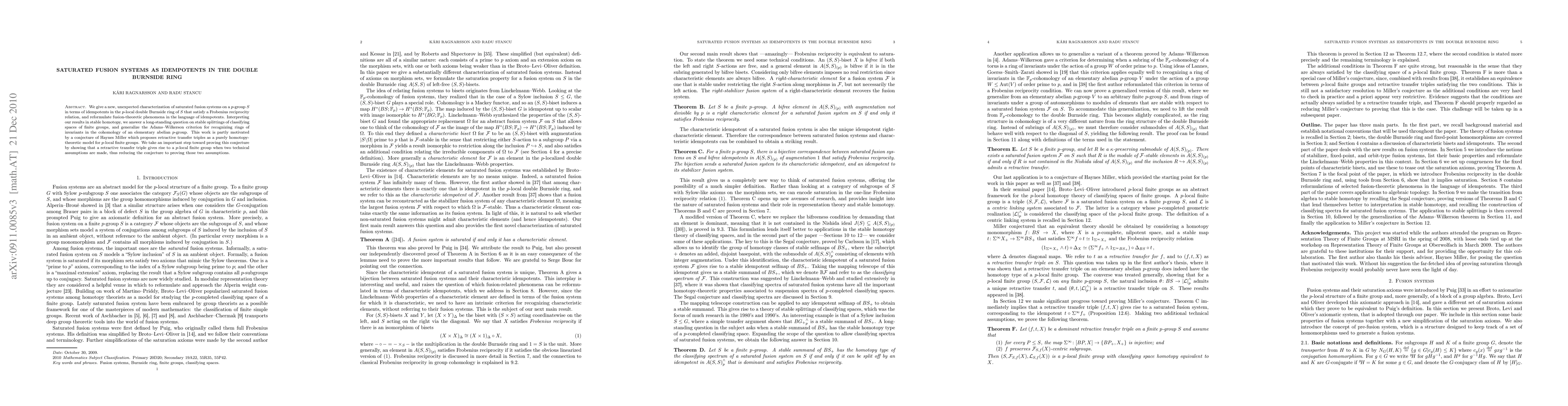 We give a new, unexpected characterization of saturated fusion systems on a p-group S in terms of idempotents in the p-local double Burnside ring of S that satisfy a Frobenius reciprocity relation, and reformulate fusion-theoretic phenomena in the language of idempotents. Interpreting our results in stable homotopy, we answer a long-standing question on stable splittings of classifying spaces of finite groups, and generalize the Adams--Wilkerson criterion for recognizing rings of invariants in the cohomology of an elementary abelian p-group. This work is partly motivated by a conjecture of Haynes Miller which proposes retractive transfer triples as a purely homotopy-theoretic model for p-local finite groups. We take an important step toward proving this conjecture by showing that a retractive transfer triple gives rise to a p-local finite group when two technical assumptions are made, thus reducing the conjecture to proving those two assumptions.