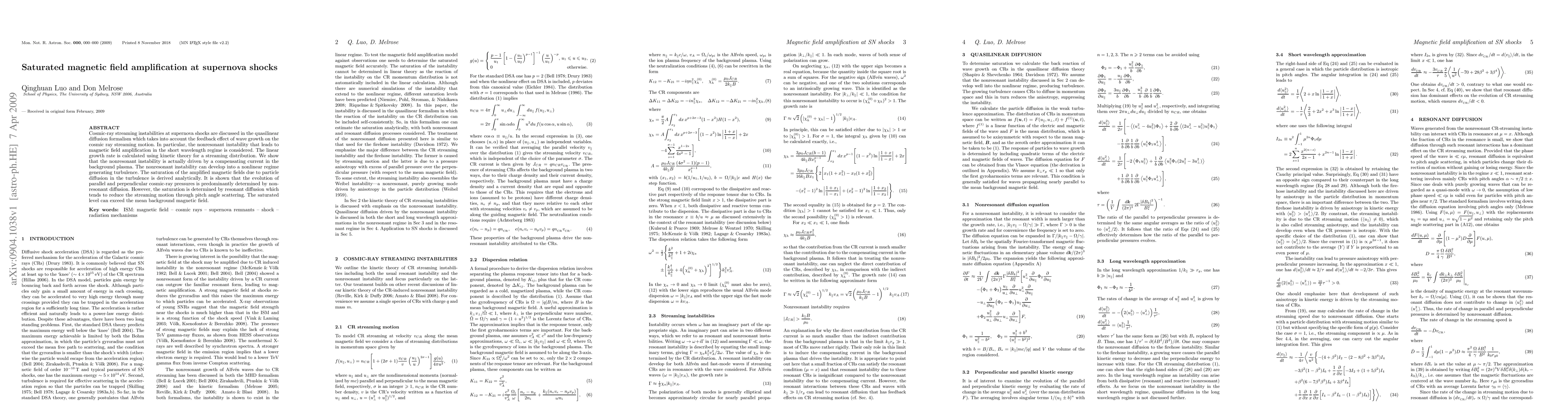 This paper investigates cosmic-ray streaming instabilities at supernova shocks, focusing on the nonresonant instability that leads to magnetic field amplification. The study derives an analytical expression for the saturation of amplified magnetic fields due to turbulence, showing that the saturation level can exceed the background magnetic field.