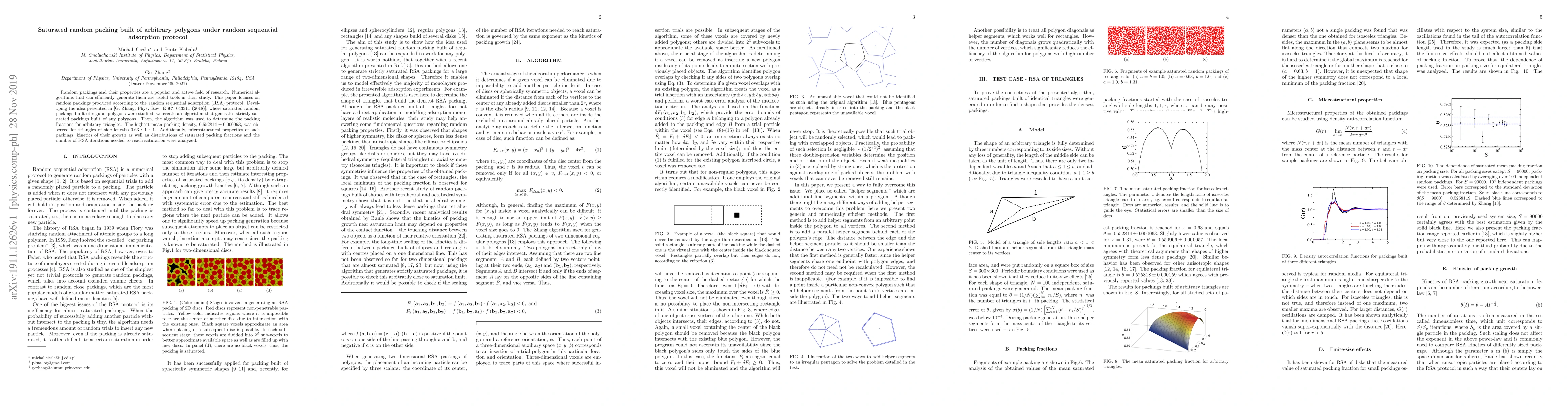 The paper presents an algorithm for generating saturated random packings of arbitrary polygons using the random sequential adsorption (RSA) protocol. The algorithm incorporates helper segments to determine if a trial particle can be added to a given area within a polygon, ensuring strictly saturated packings.