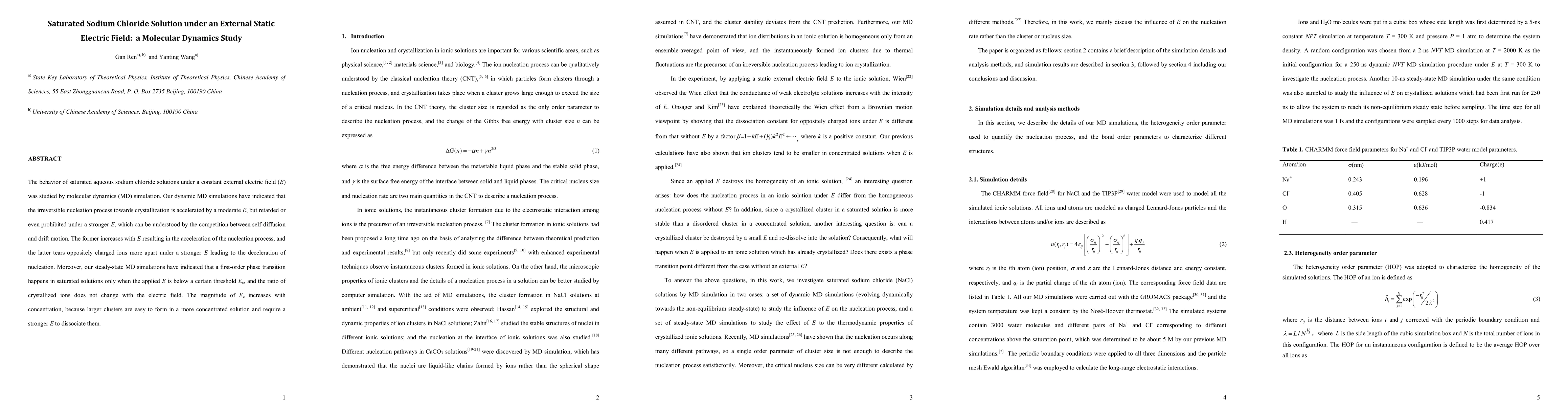 The behavior of saturated aqueous sodium chloride solutions under a constant external electric field (E) was studied by molecular dynamics (MD) simulation. Our dynamic MD simulations have indicated that the irreversible nucleation process towards crystallization is accelerated by a moderate E, but retarded or even prohibited under a stronger E, which can be understood by the competition between self-diffusion and drift motion. The former increases with E resulting in the acceleration of the nucleation process, and the latter tears oppositely charged ions more apart under a stronger E leading to the deceleration of nucleation. Moreover, our steady-state MD simulations have indicated that a first-order phase transition happens in saturated solutions only when the applied E is below a certain threshold Ec, and the ratio of crystallized ions does not change with the electric field. The magnitude of Ec increases with concentration, because larger clusters are easy to form in a more concentrated solution and require a stronger E to dissociate them.