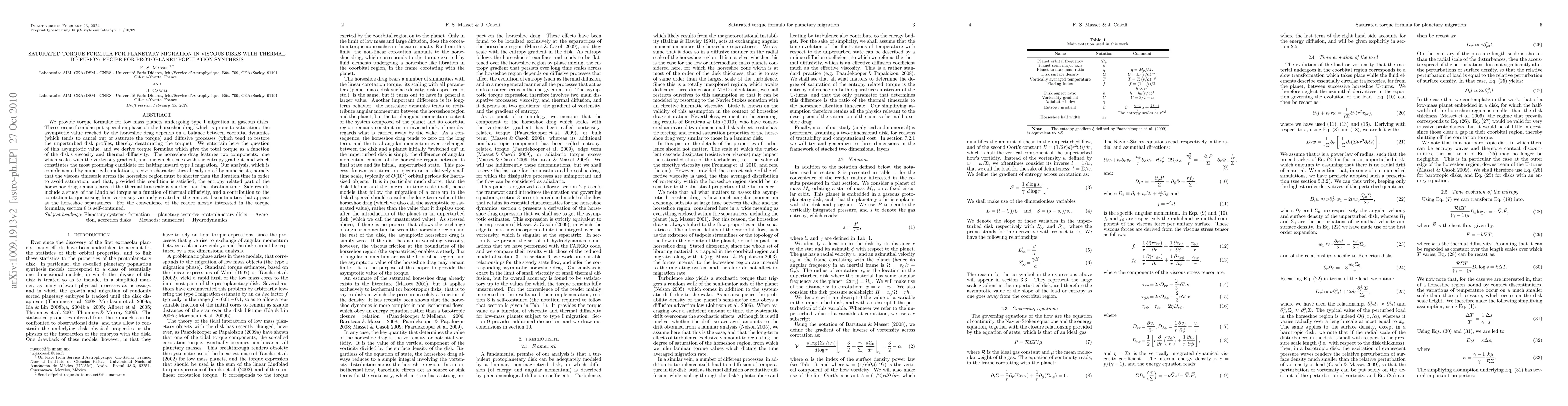This paper provides torque formulae for low mass planets in gaseous disks, focusing on the saturation of horseshoe drag during type I migration. It derives expressions for total torque based on disk viscosity and thermal diffusivity, emphasizing the entropy gradient component as a potential migration halt mechanism. Numerical simulations support the findings, highlighting conditions to avoid torque saturation.