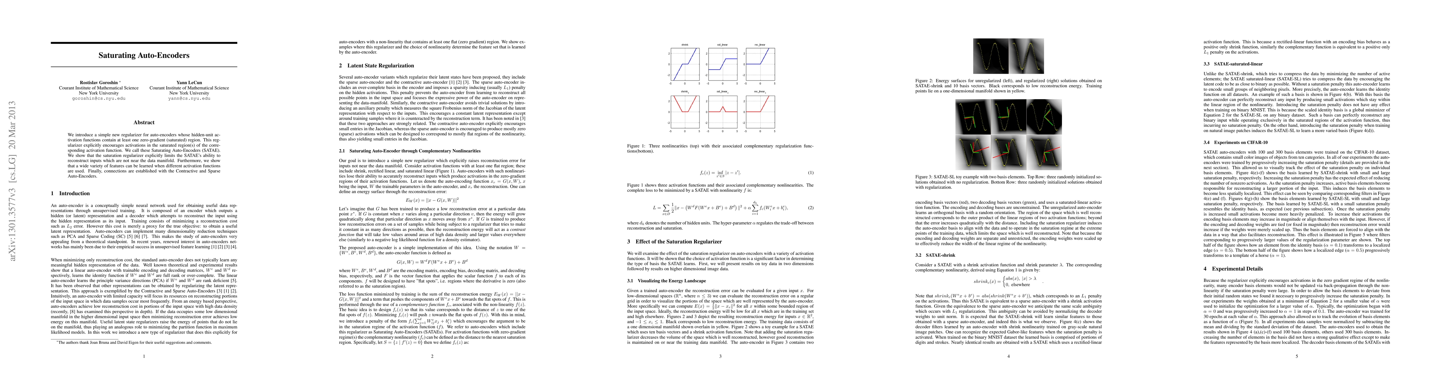 This paper proposes a new regularizer for auto-encoders called Saturating Auto-Encoders (SATAE) that encourages activations in saturated regions of the activation functions, limiting the model's ability to reconstruct inputs far from the data manifold. The study demonstrates that diverse features can be learned using different activation functions and connects SATAE with Contractive and Sparse Auto-Encoders.