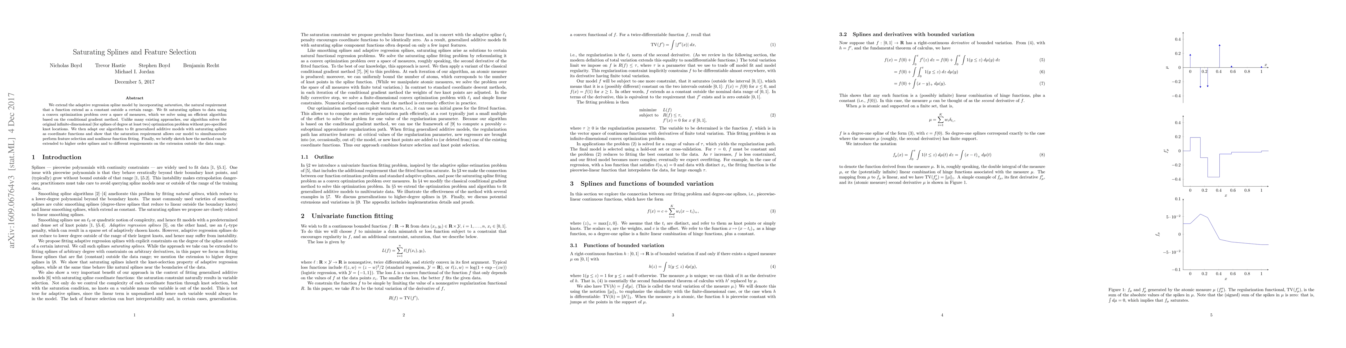 This research introduces saturating splines, extending adaptive regression models to incorporate saturation, a natural function behavior outside a data range. The method solves an optimization problem over measures using a conditional gradient algorithm, avoiding pre-specified knot locations. It also adapts to generalized additive models, performing feature selection and nonlinear fitting simultaneously. The approach can be extended to higher order splines and various extension requirements outside the data range.