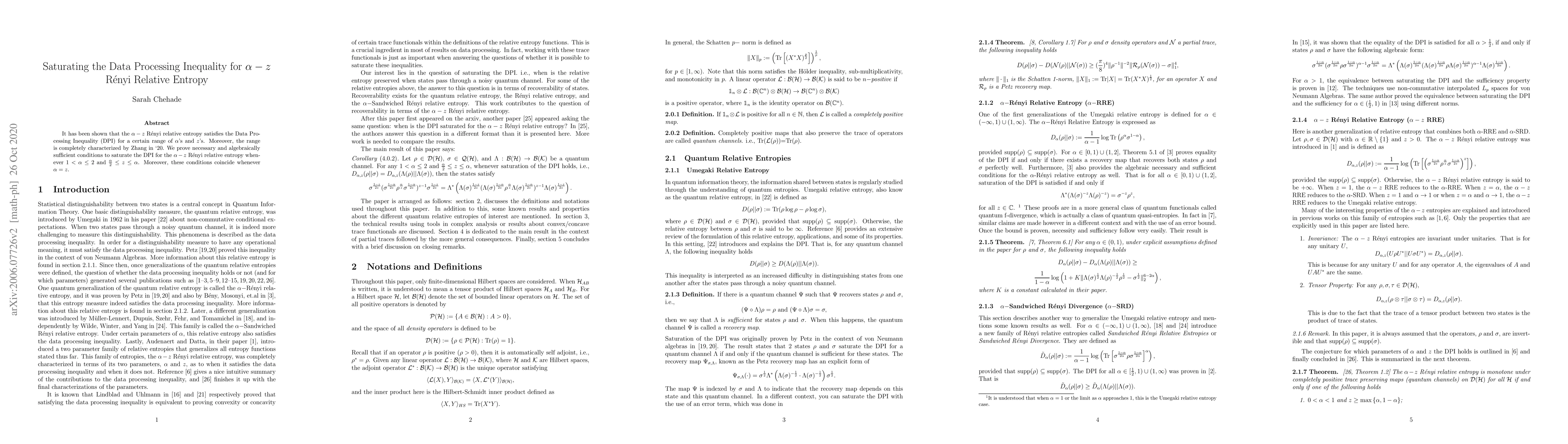 This paper proves necessary and sufficient algebraic conditions for saturating the Data Processing Inequality (DPI) for $\alpha-z$ Rényi relative entropy when $1<\alpha\leq 2$ and $\frac{\alpha}{2}\leq z\leq\alpha$, with the conditions coinciding when $\alpha=z$.