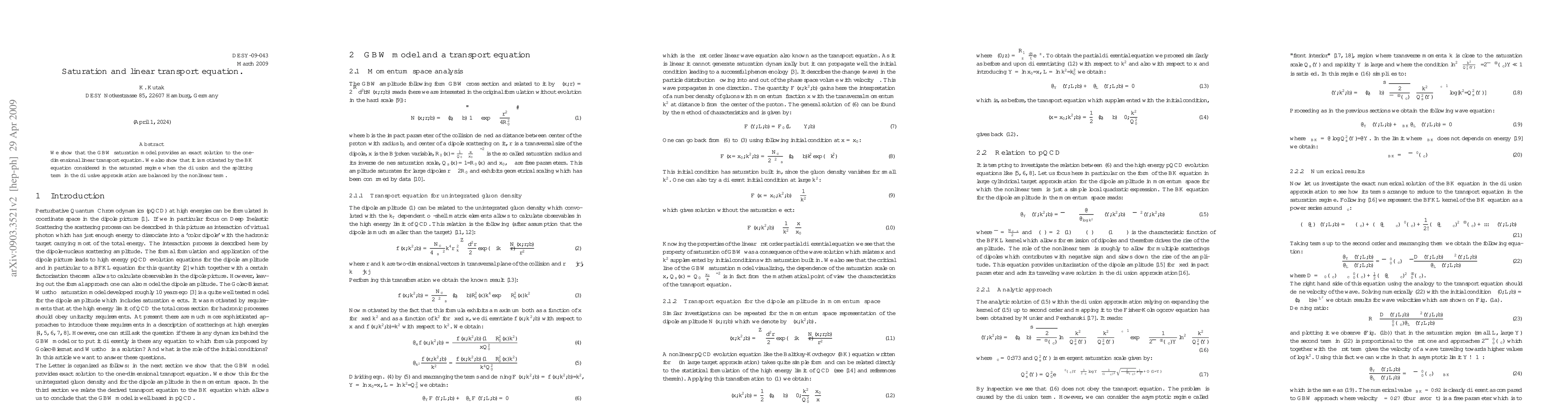 The GBW saturation model exactly solves the one-dimensional linear transport equation and is derived from the BK equation when diffusion and splitting terms balance the nonlinear term in a saturated regime.