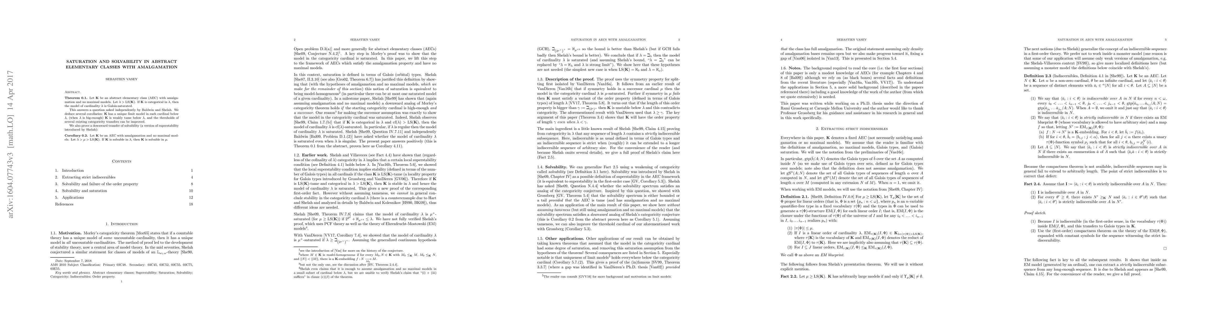 This paper explores saturation and solvability in abstract elementary classes (AECs) with amalgamation, proving that if an AEC is categorical in a cardinal above its Löwenheim-Skolem number and has no maximal models, then the model of that cardinal is Galois-saturated. It also establishes a downward transfer of solvability, showing that if an AEC is solvable in a larger cardinal, it remains solvable in smaller cardinals.