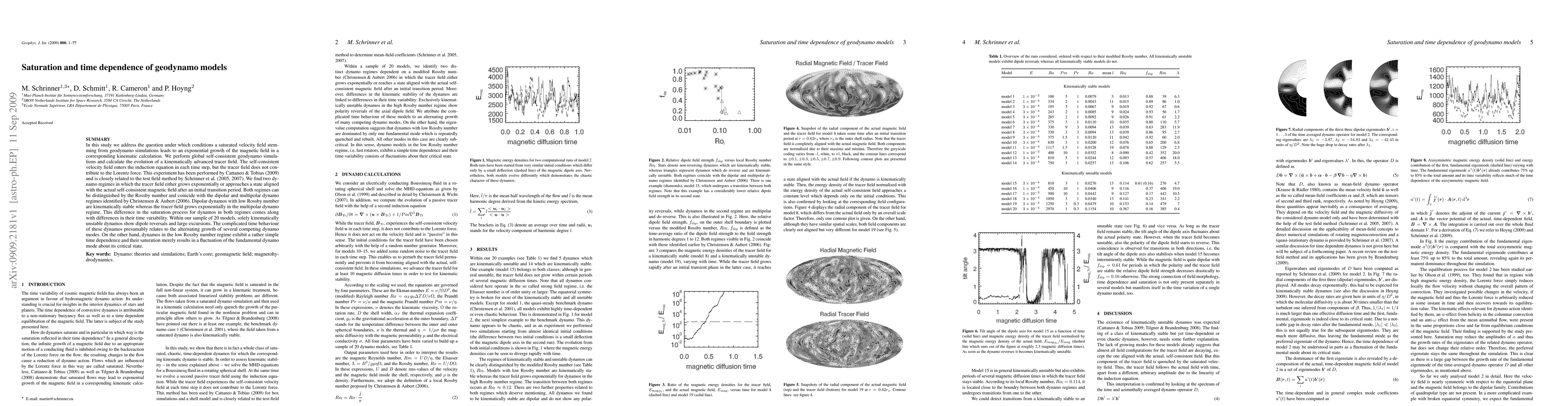 This study investigates the saturation and time dependence of geodynamo models, finding that saturated velocity fields lead to either exponential magnetic field growth or alignment with the self-consistent magnetic field, depending on the Rossby number. Dynamos with low Rossby numbers are stable, while multipolar dynamos exhibit complex time behavior and dipole reversals.
