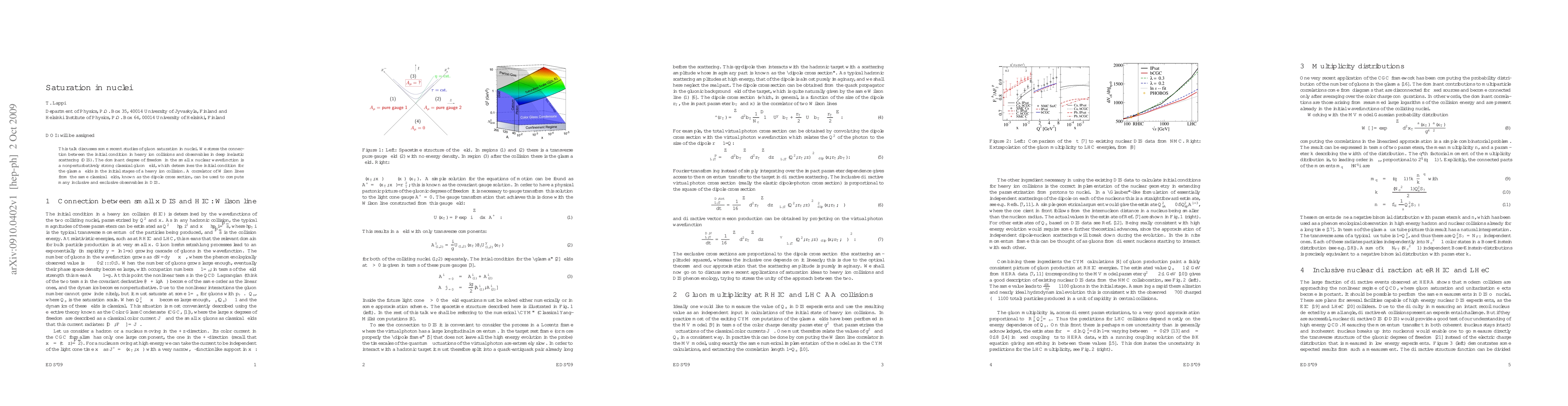 This talk discusses some recent studies of gluon saturation in nuclei. We stress the connection between the initial condition in heavy ion collisions and observables in deep inelastic scattering (DIS). The dominant degree of freedom in the small x nuclear wavefunction is a nonperturbatively strong classical gluon field, which determines the initial condition for the glasma fields in the initial stages of a heavy ion collision. A correlator of Wilson lines from the same classical fields, known as the dipole cross section, can be used to compute many inclusive and exclusive observables in DIS.