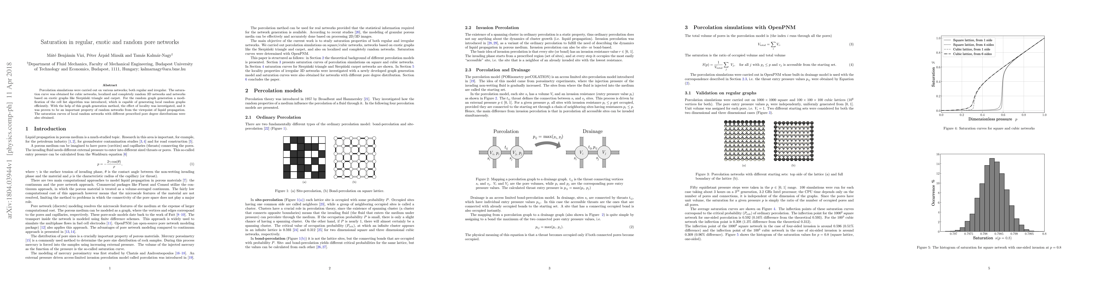 This paper investigates saturation curves in various pore networks, including cubic, localized, and random 3D networks, as well as networks based on exotic graphs. A modified cell list algorithm was developed for efficient random graph generation, highlighting the importance of locality in liquid propagation.