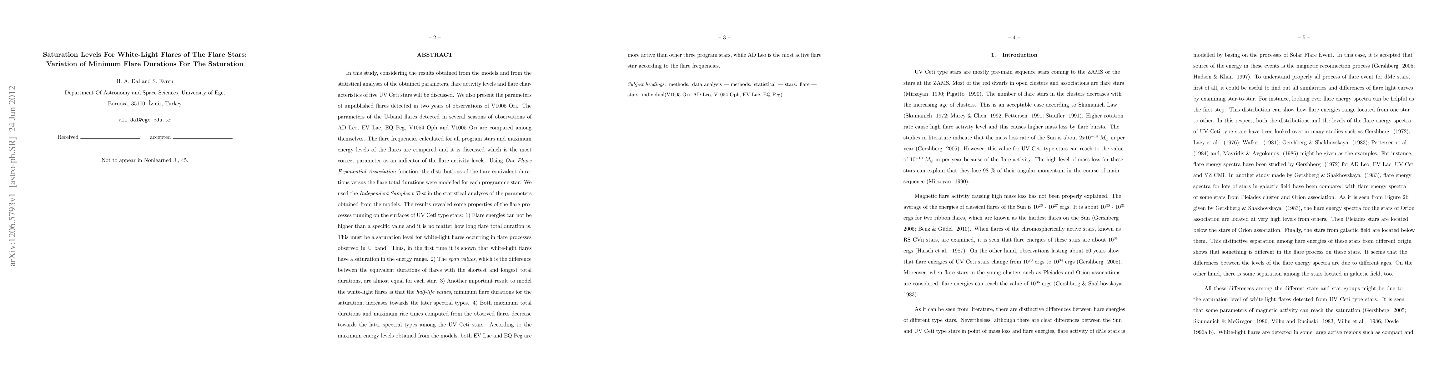 Taking into account results obtained from models and from statistical analyses of obtained parameters, we discuss flare activity levels and flare characteristics of five UV Ceti stars. We present the parameters of unpublished flares detected over two years of observations of V1005 Ori. We compare parameters of the U-band flares detected over several seasons of observations of AD Leo, EV Lac, EQ Peg, V1054 Oph, and V1005 Ori. Flare frequencies calculated for all program stars and maximum energy levels of the flares are compared, and we consider which is the most correct parameter as an indicator of flare activity levels. Using the One Phase Exponential Association function, the distributions of flare equivalent duration versus flare total duration are modeled for each program star. We use the Independent Samples t-Test in the statistical analyses of the parameters obtained from the models. The results reveal some properties of flare processes occurring on the surfaces of UV Ceti type stars. (1) Flare energies cannot be higher than a specific value regardless of the length of the flare total duration. This must be a saturation level for white-light flares occurring in flare processes observed in the U band. Thus, for the first time it is shown that white-light flares have a saturation in a specific energy range. (2) The span values, which are the difference between the equivalent durations of flares with the shortest and longest total durations, are almost equal for each star. (3) The half-life values, minimum flare durations for saturation, increase toward the later spectral types.