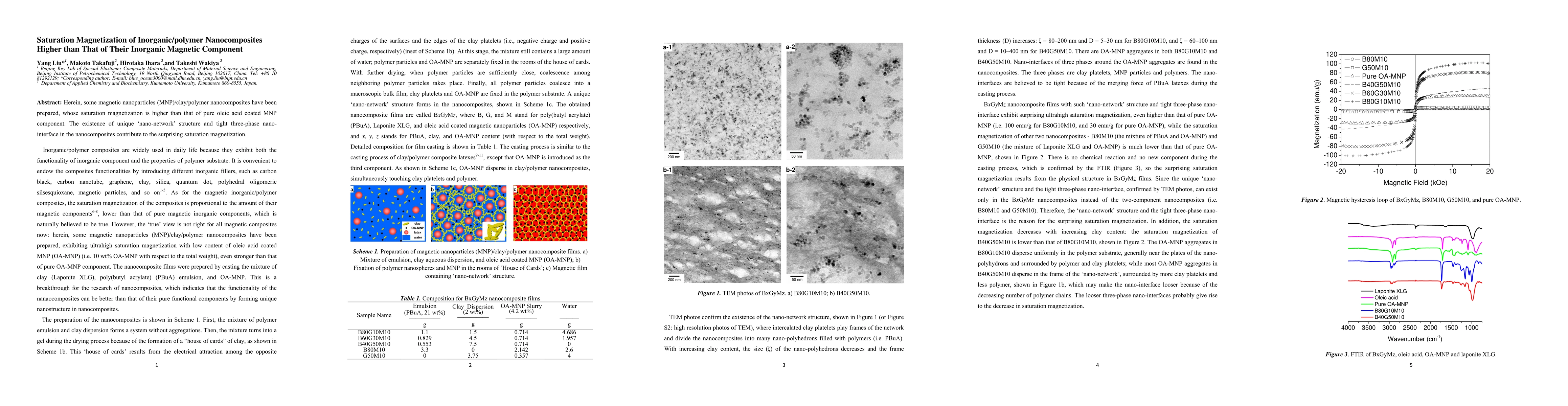 Herein, some magnetic nanoparticles (MNP)/clay/polymer nanocomposites have been prepared, whose saturation magnetization is higher than that of pure oleic acid coated MNP component. The existence of unique 'nano-network' structure and tight three-phase nano-interface in the nanocomposites contribute to the surprising saturation magnetization.