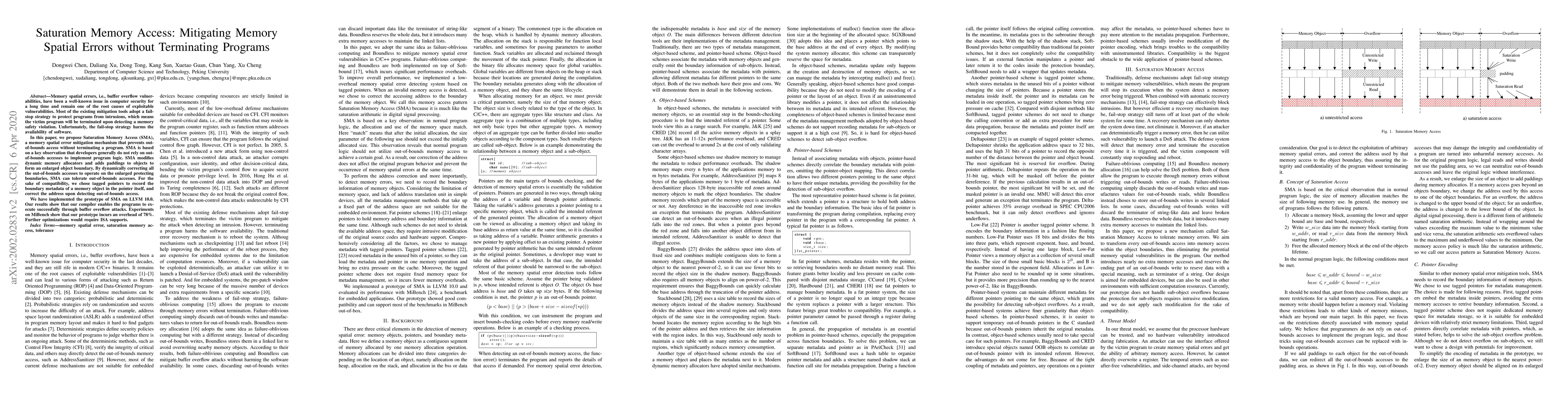 This paper introduces Saturation Memory Access (SMA), a mechanism to mitigate memory spatial errors (like buffer overflows) without terminating programs. SMA modifies memory allocators, adds object paddings, and uses tagged pointers to correct out-of-bounds accesses, ensuring program continuity. Initial implementation on LLVM 10.0 showed successful execution through attacks, with a 78% overhead, indicating potential for future ISA-level optimizations.