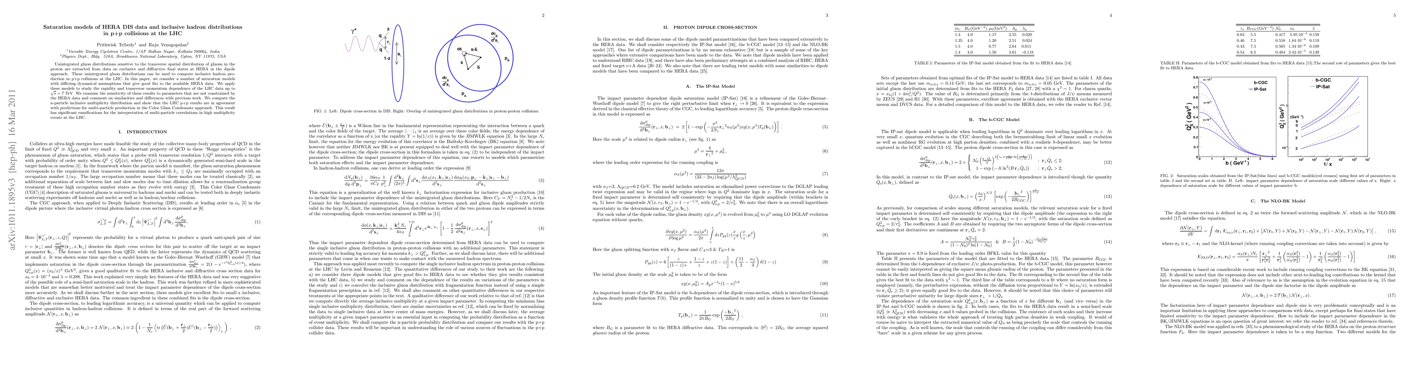 Unintegrated gluon distributions sensitive to the transverse spatial distribution of gluons in the proton are extracted from data on exclusive and diffractive final states at HERA in the dipole approach. These unintegrated gluon distributions can be used to compute inclusive hadron production in p+p collisions at the LHC. In this paper, we consider a number of saturation models with differering dynamical assumptions that give good fits to the available HERA data. We apply these models to study the rapidity and transverse momentum dependence of the LHC data up to $\sqrt{s} = 7$ TeV. We examine the sensitivity of these results to parameters that are not constrained by the HERA data and comment on similarities and differences with previous work. We compute the n-particle inclusive multiplicity distribution and show that the LHC p+p results are in agreement with predictions for multi-particle production in the Color Glass Condensate approach. This result has significant ramifications for the interpretation of multi-particle correlations in high multiplicity events at the LHC.