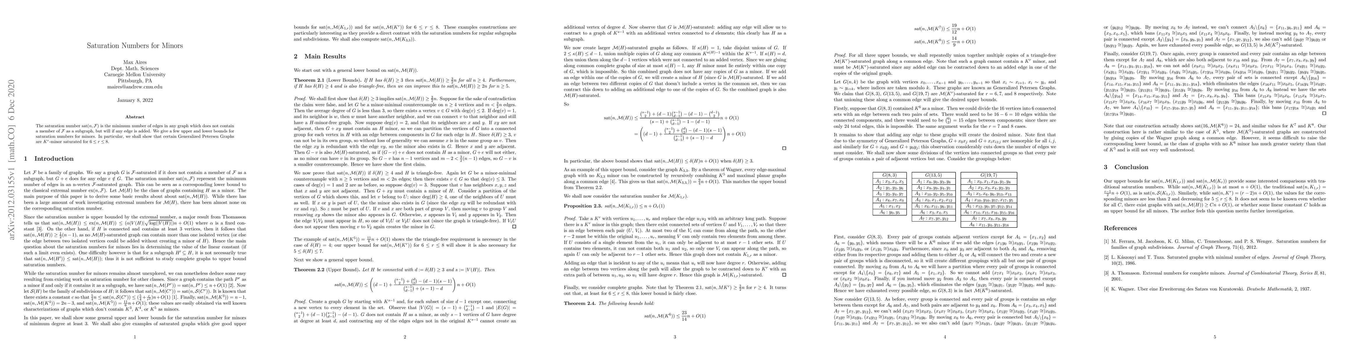This paper investigates the saturation number $\text{sat}(n,\mathcal{F})$, which measures the minimum edges needed in a graph to avoid a specific subgraph $\mathcal{F}$ but will contain it upon any additional edge. The study provides bounds for saturation numbers concerning minors and demonstrates that certain Generalized Petersen Graphs are $K^r$-minor saturated for $6\le r\le 8$.
