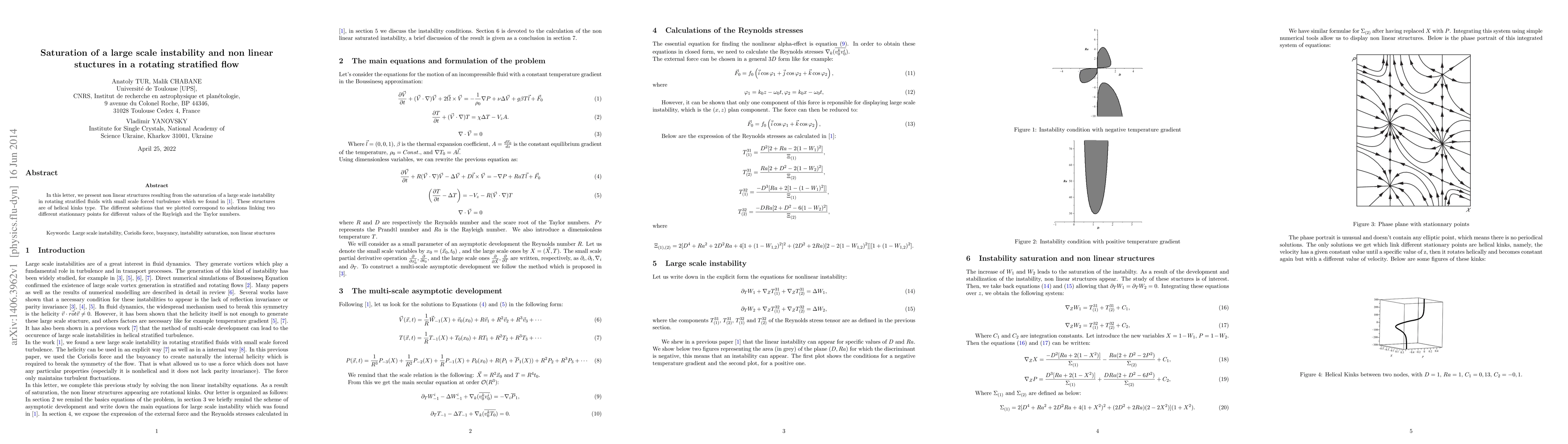 This paper investigates the saturation of large-scale instabilities in rotating stratified fluids, revealing helical kink structures from forced turbulence. The study maps solutions linking stationary points across varying Rayleigh and Taylor numbers.