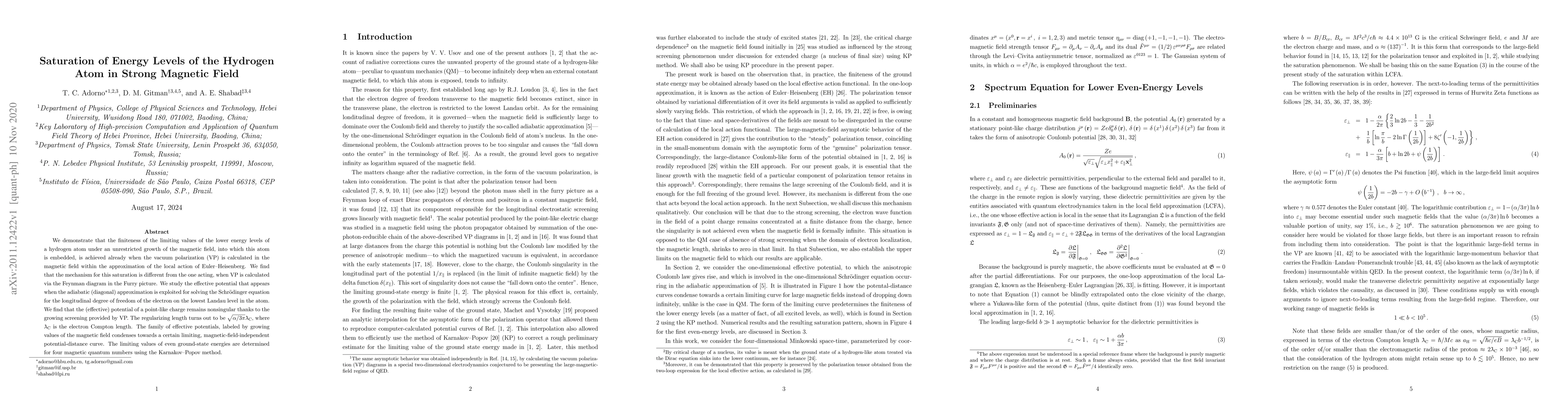 Researchers demonstrate that a hydrogen atom's energy levels in a strong magnetic field become saturated due to vacuum polarization effects, leading to finite limiting values of lower energy levels.