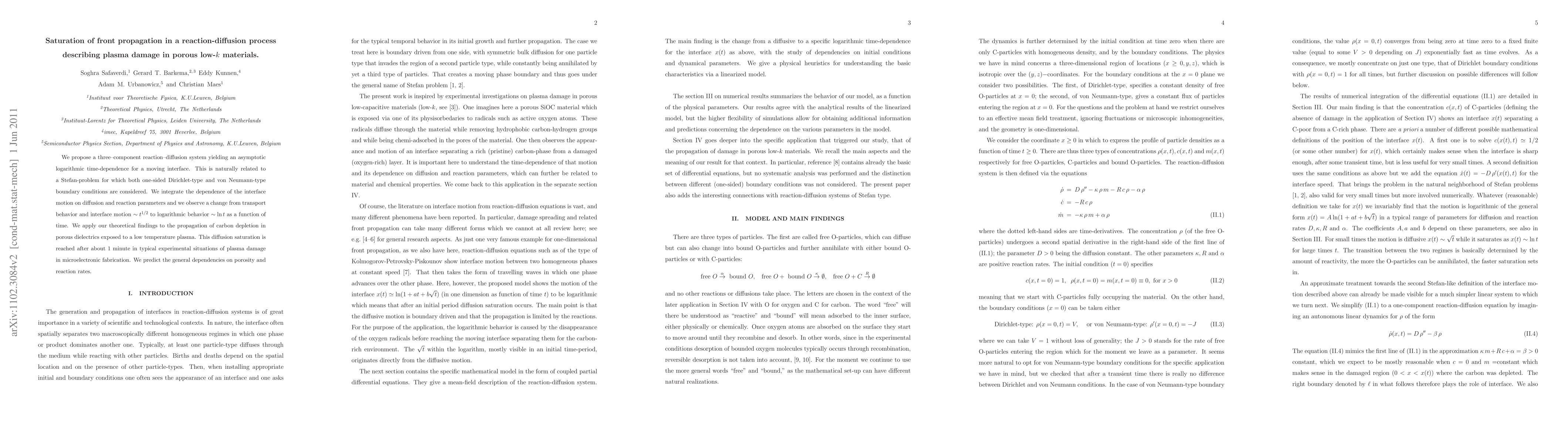 Researchers develop a reaction-diffusion model to study plasma damage in porous materials, finding that the interface propagation becomes saturated after 1 minute, following a logarithmic time-dependence.