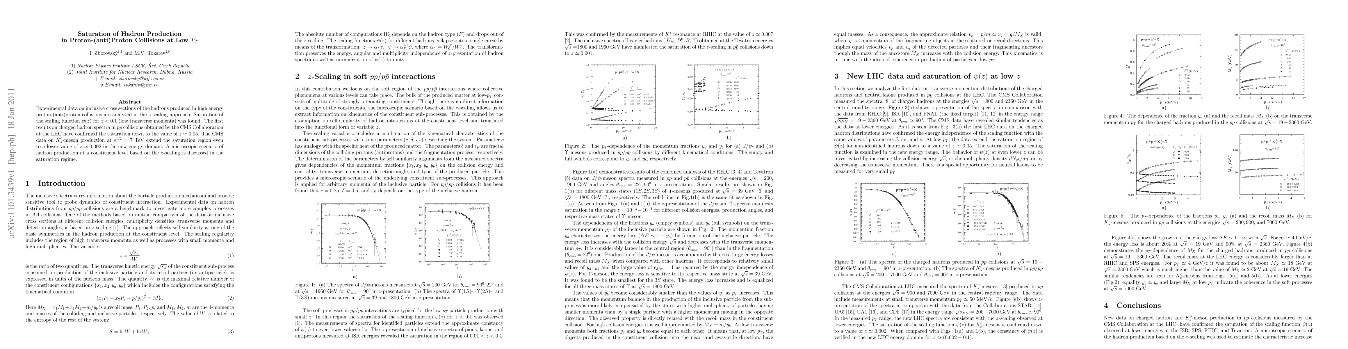 Experimental data on inclusive cross sections of the hadrons produced in high energy proton-(anti)proton collisions are analyzed in the z-scaling approach. Saturation of the scaling function PSI(z) for z<0.1 (low transverse momenta) was found. The first results on charged hadron spectra in pp collisions obtained by the CMS Collaboration at the LHC have confirmed the saturation down to the value of z=0.05. The CMS data on neutral K-meson production at s^{1/2}=7 TeV extend the saturation region even to a lower value of z=0.002 in the new energy domain. A microscopic scenario of hadron production at a constituent level based on the z-scaling is discussed in the saturation regime.