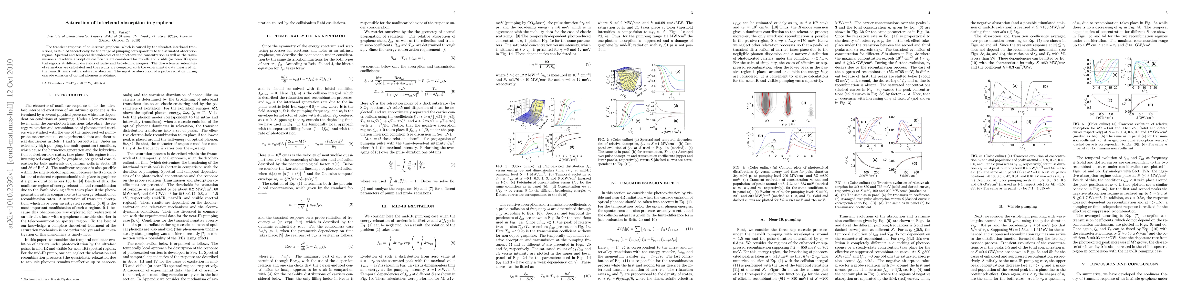 This paper theoretically investigates the transient interband absorption saturation in graphene under ultrafast pumping, analyzing spectral and temporal dependencies in mid-IR and visible regions. The study calculates saturation intensities and compares results with experimental data from near-IR laser measurements, revealing negative absorption due to optical phonon cascade emission.