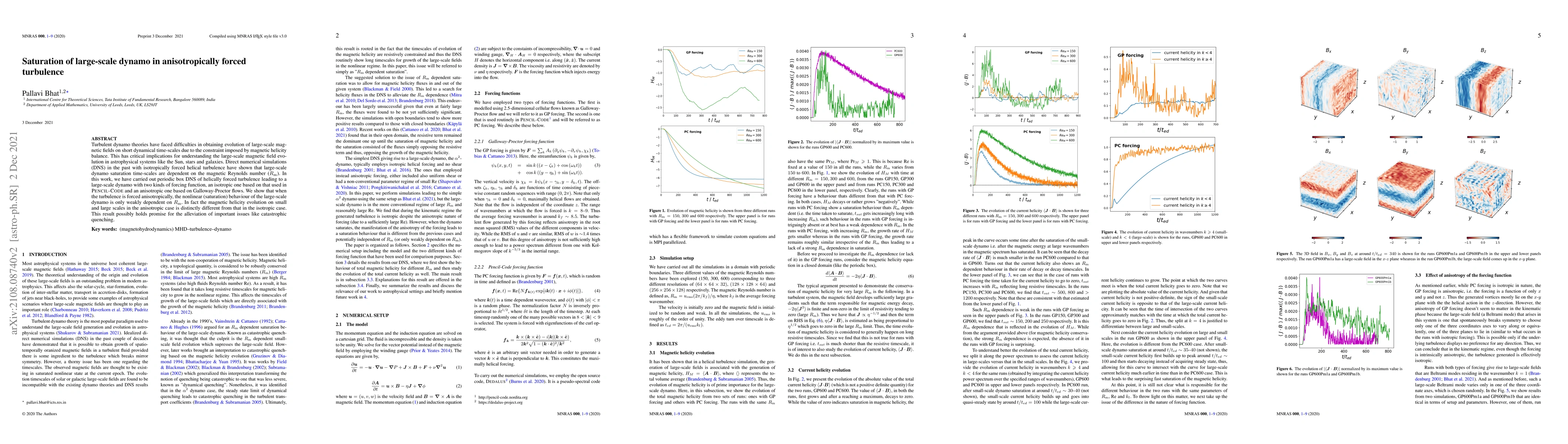 This study investigates the saturation behavior of large-scale dynamos in anisotropically forced turbulence through direct numerical simulations, revealing that anisotropic forcing leads to a weak dependence on magnetic Reynolds number compared to isotropic forcing, potentially alleviating issues like catastrophic quenching.