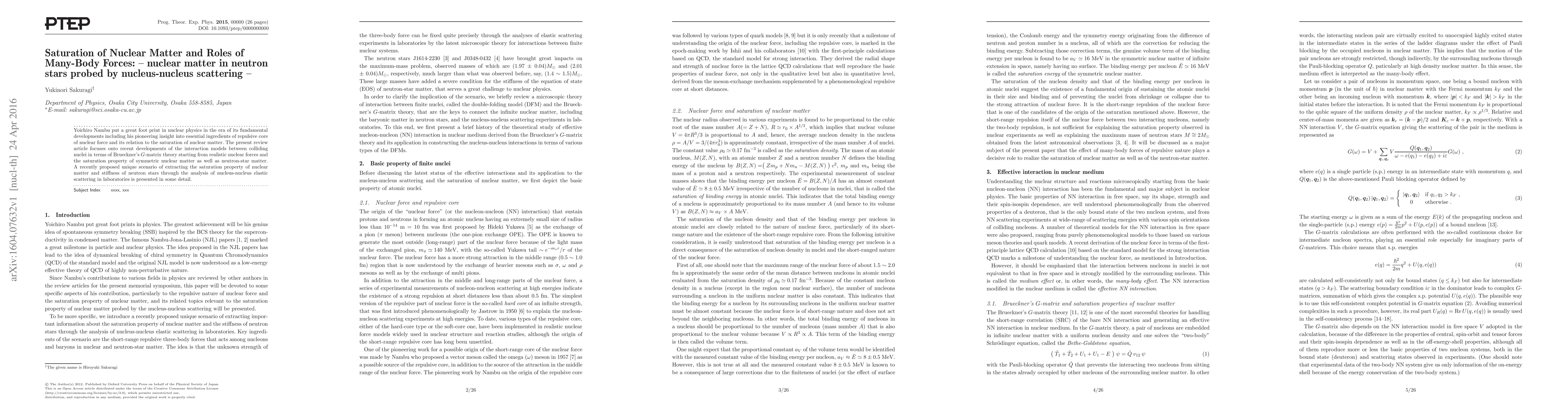 Yoichiro Nambu put a great foot print in nuclear physics in the era of its fundamental developments including his pioneering insight into essential ingredients of repulsive core of nuclear force and its relation to the saturation of nuclear matter. The present review article focuses onto recent developments of the interaction models between colliding nuclei in terms of Brueckner's G-matrix theory staring from realistic nuclear forces and the saturation property of symmetric nuclear matter as well as neutron-star matter. A recently proposed unique scenario of extracting the saturation property of nuclear matter and stiffness of neutron stars through the analysis of nucleus-nucleus elastic scattering in laboratories is presented in some detail.