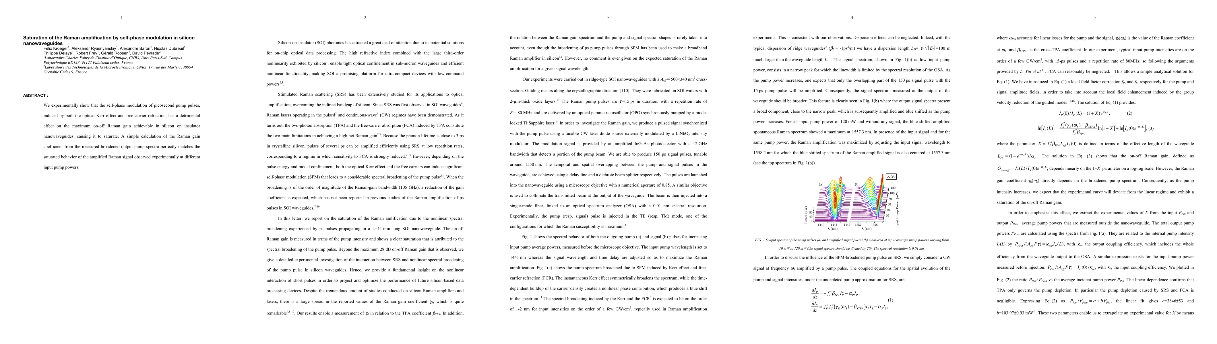 This paper demonstrates experimentally that self-phase modulation in silicon nanowaveguides limits the maximum Raman amplification, causing saturation. The study shows that both the optical Kerr effect and free-carrier refraction contribute to this effect, and calculated Raman gain coefficients match the observed saturation behavior.