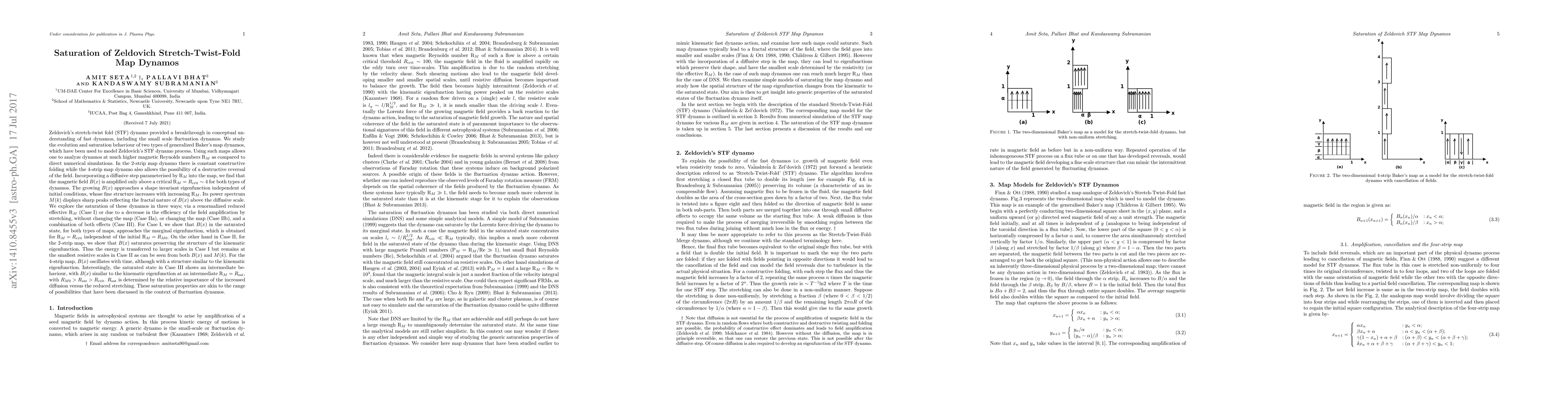 Zeldovich's stretch-twist fold (STF) dynamo provided a breakthrough in conceptual understanding of fast dynamos, including fluctuation or small scale dynamos. We study the evolution and saturation behaviour of two types of Baker's map dynamos, which have been used to model Zeldovich's STF dynamo process. Using such maps allows one to analyze dynamos at much higher magnetic Reynolds numbers $R_M$ as compared to direct numerical simulations. In the 2-strip map dynamo there is constant constructive folding while the 4-strip map dynamo also allows the possibility of field reversal. Incorporating a diffusive step parameterised by $R_M$, we find that the magnetic field $B(x)$ is amplified only above a critical $R_M=R_{crit} \sim 4$ for both types of dynamos. We explore the saturation of these dynamos in 3 ways; by a renormalized decrease of the effective $R_M$ (Case I) or due to a decrease in the efficiency of field amplification by stretching (Case II), or a combination of both effects (Case III). For Case I, we show that $B(x)$ in the saturated state, for both types of maps, goes back to the marginal eigenfunction, which is obtained for the critical $R_M=R_{crit}$. This is independent of the initial $R_M=R_{M0}$. On the other hand in Case II, for the 2-strip map, we show that $B(x)$ now saturates preserving the structure of the kinematic eigenfunction. Thus the energy is transferred to larger scales in Case I but remains at the smallest resistive scales in Case II. For the 4-strip map, the $B(x)$ oscillates with time, although with a structure similar to the kinematic eigenfunction. Interestingly, the saturated state for Case III shows an intermediate behaviour, with $B(x)$ now similar to the kinematic eigenfunction for an intermediate $R_M=R_{sat}$, with $R_{M0}>R_{sat}>R_{crit}$. These saturation properties are akin to the ones discussed in the context of fluctuation dynamos.