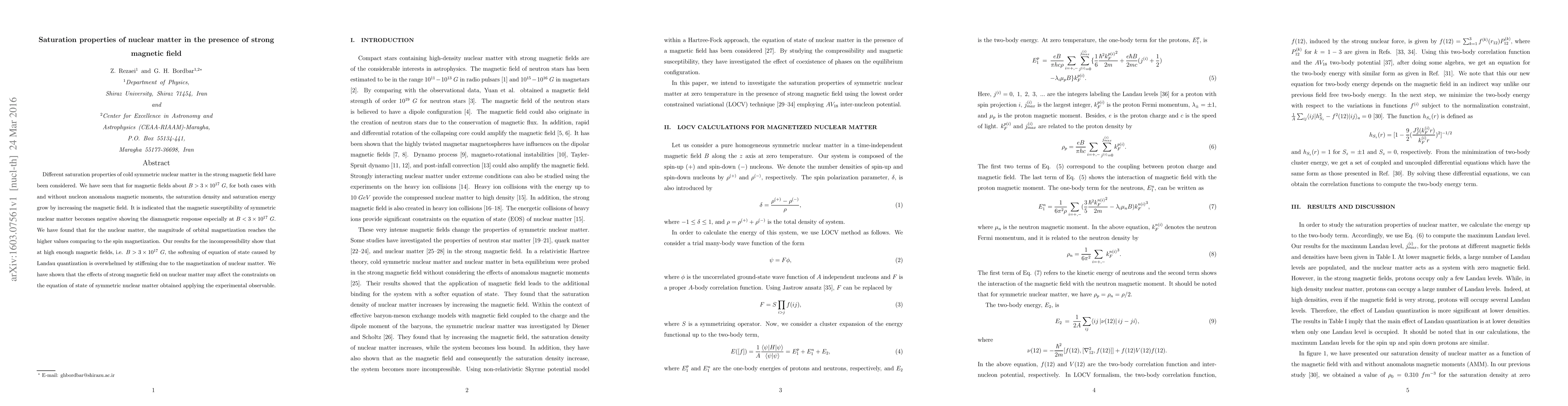 This paper investigates the saturation properties of cold symmetric nuclear matter under strong magnetic fields, finding that above $B> 3 \times 10^{17}\ G$, saturation density and energy increase, while magnetic susceptibility becomes negative, indicating diamagnetic behavior. The study also reveals that orbital magnetization dominates over spin magnetization and that high magnetic fields can stiffen the nuclear matter equation of state.